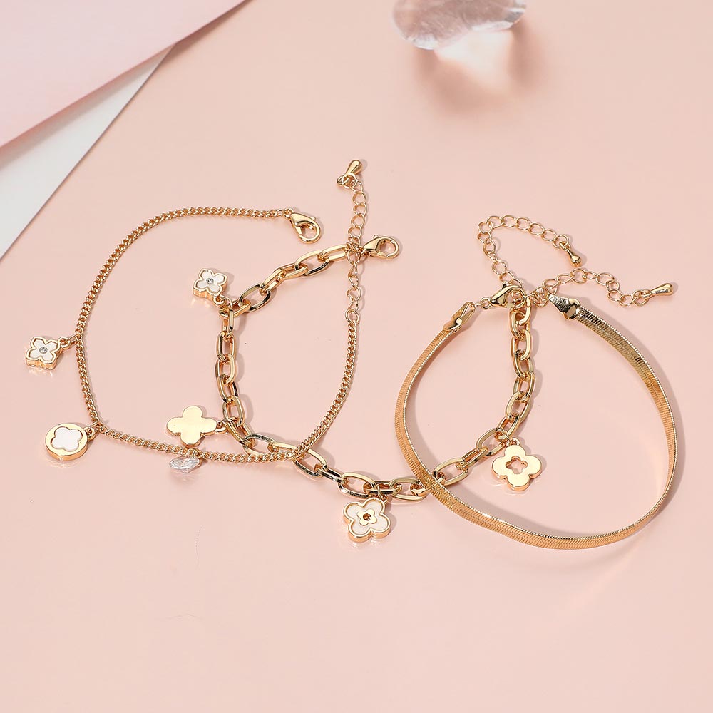 Details • Size : 1" H, 7" + 1.5" L • Lobster Clasp Closure • Stylish bracelet set featuring delicate chain links, floral charms, and adjustable closures. Perfect for layering or wearing alone to enhance everyday outfits with a touch of elegance. • Lead and Nickel Compliant