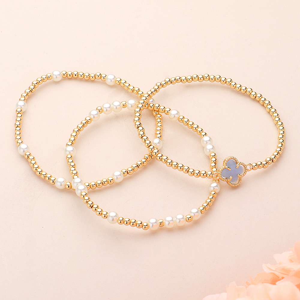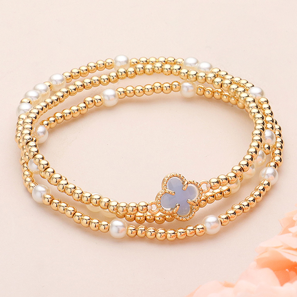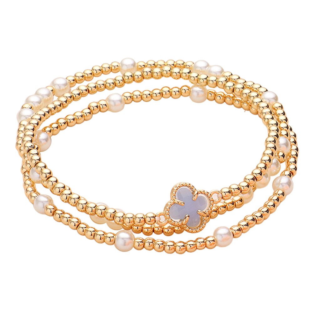 3PCS - Quatrefoil Pointed Pearl Metal Ball Beaded Stretch Multi Layered Bracelets