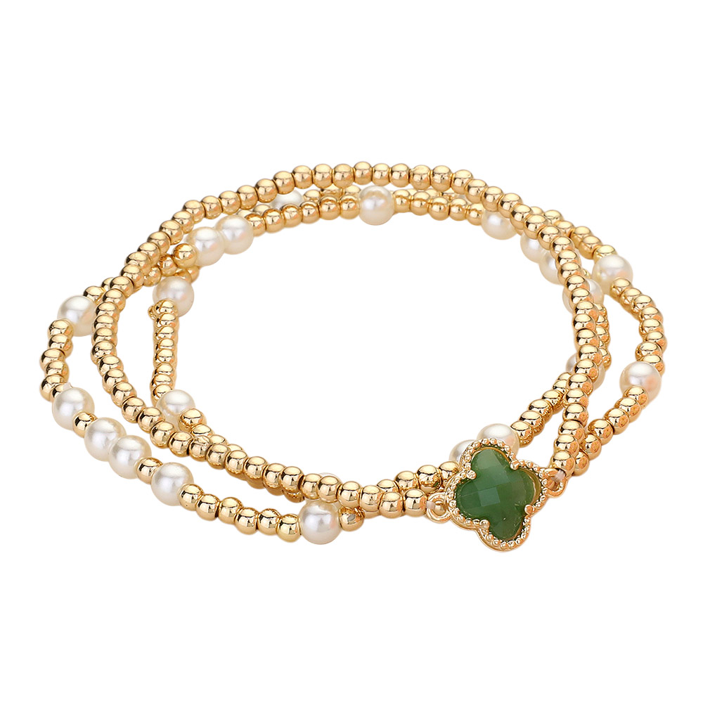 3PCS - Quatrefoil Pointed Pearl Metal Ball Beaded Stretch Multi Layered Bracelets