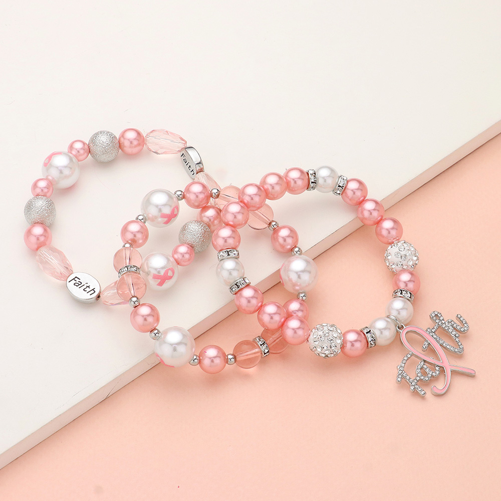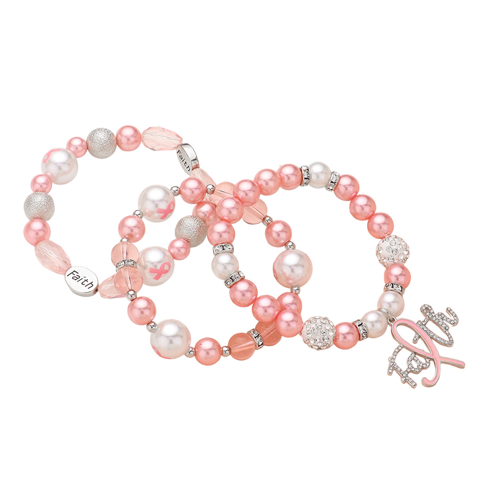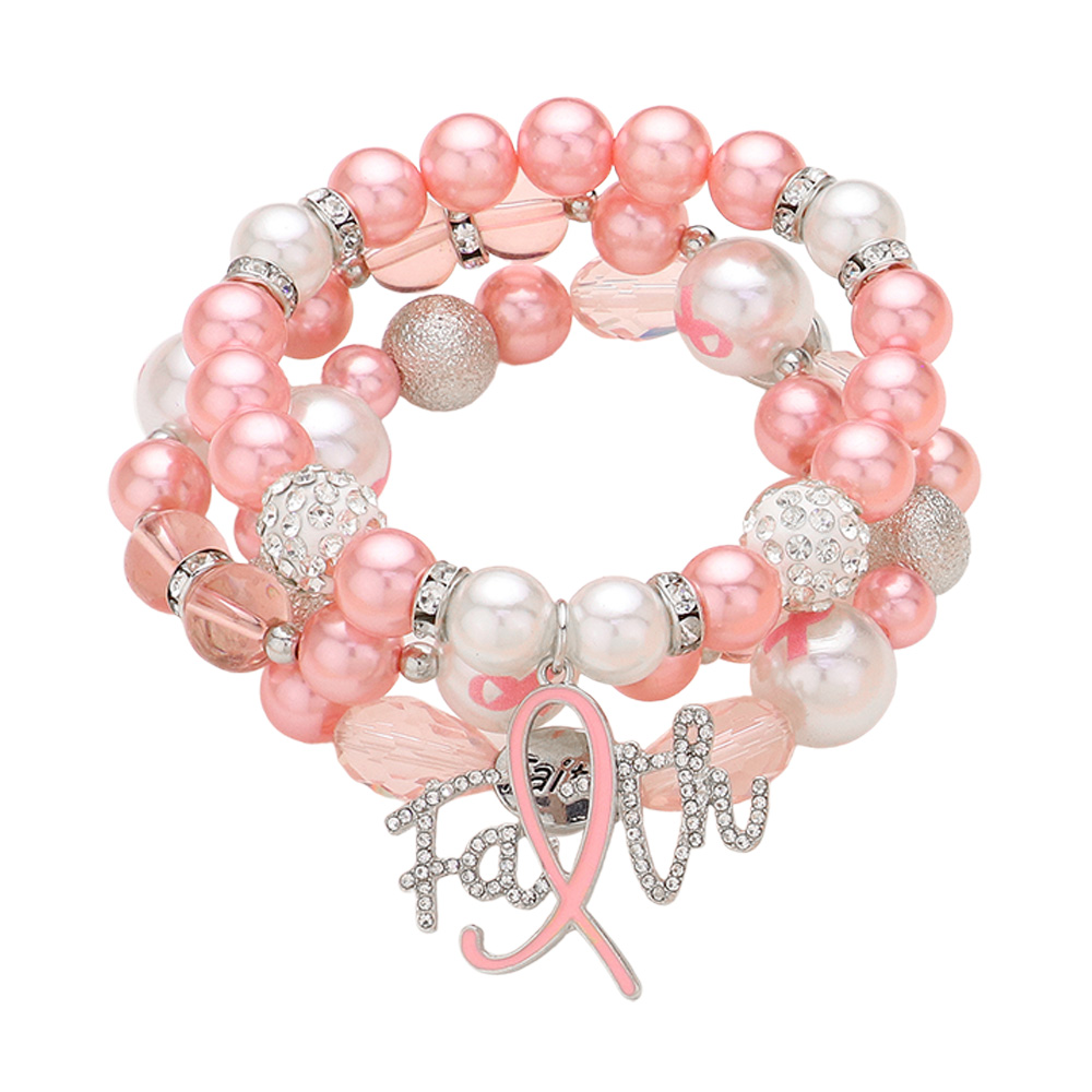 Details • Size : 2.5" H • Stretchable • Elegant beaded bracelet set with shimmering faux pearls, crystal accents, and a “Faith” charm featuring an awareness ribbon. A bold and stylish accessory symbolizing strength, hope, and meaningful support. • Lead and Nickel Compliant