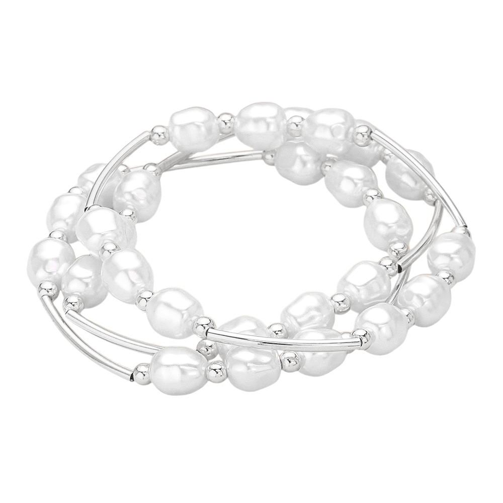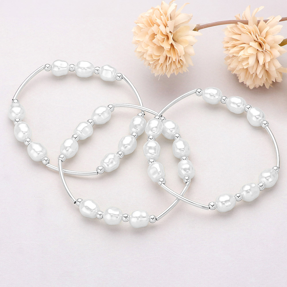 3PCS - Triple Freshwater Pearl Beaded Station Stretch Multi Layered Bracelets