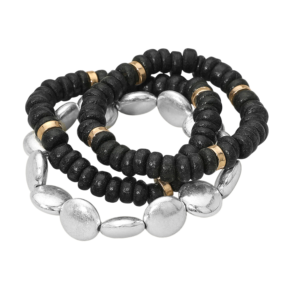 Details • Size : 1.25" H • Stretchable • This stretch bracelet set features a bold mix of smooth and textured beads paired with metallic accents, offering a versatile layered style. Perfect for stacking or wearing individually, these bracelets add a modern touch to casual outfits and elevate your look for any occasion. • Lead and Nickel Compliant