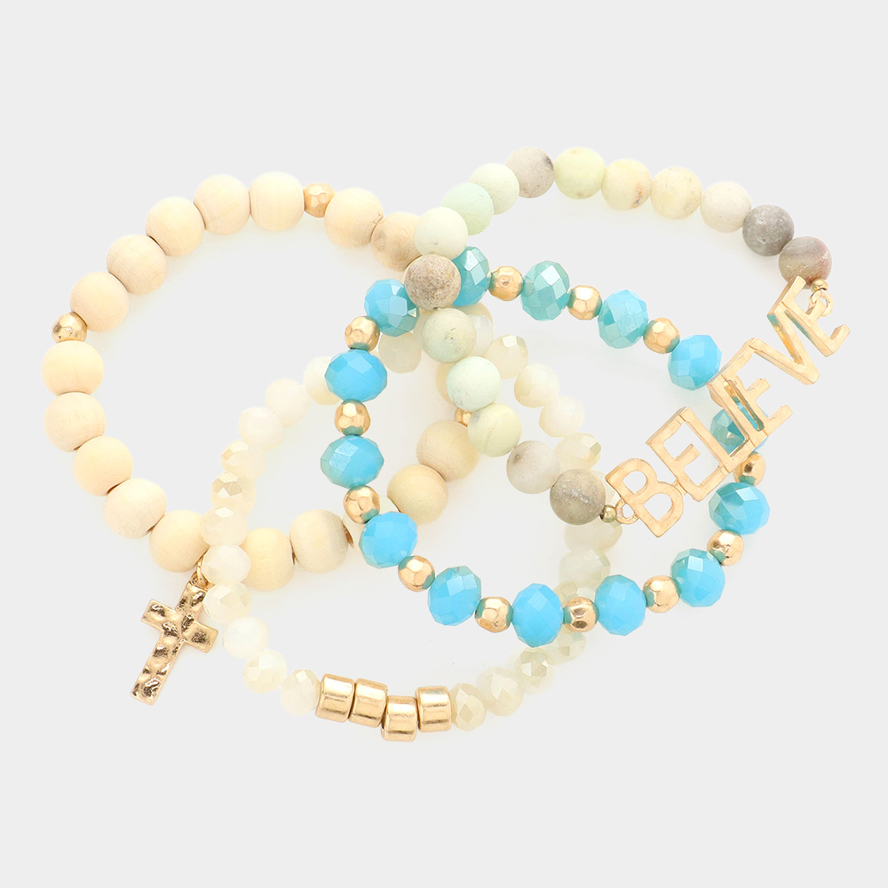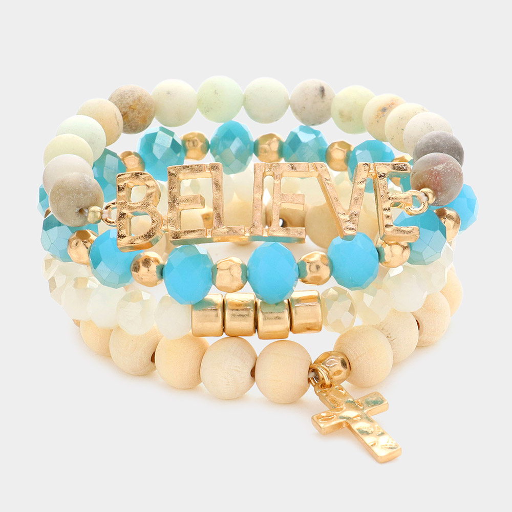 4PCS - Believe Message Cross Charm Semi Precious Wood Ball Faceted Beaded Stretch Bracelets