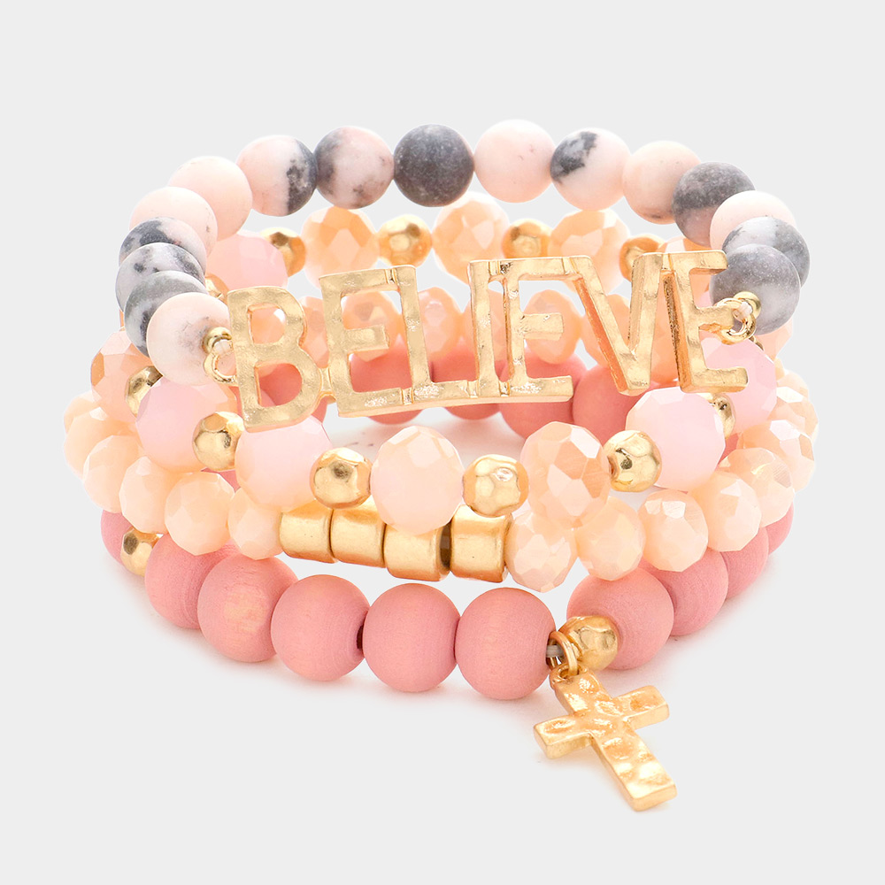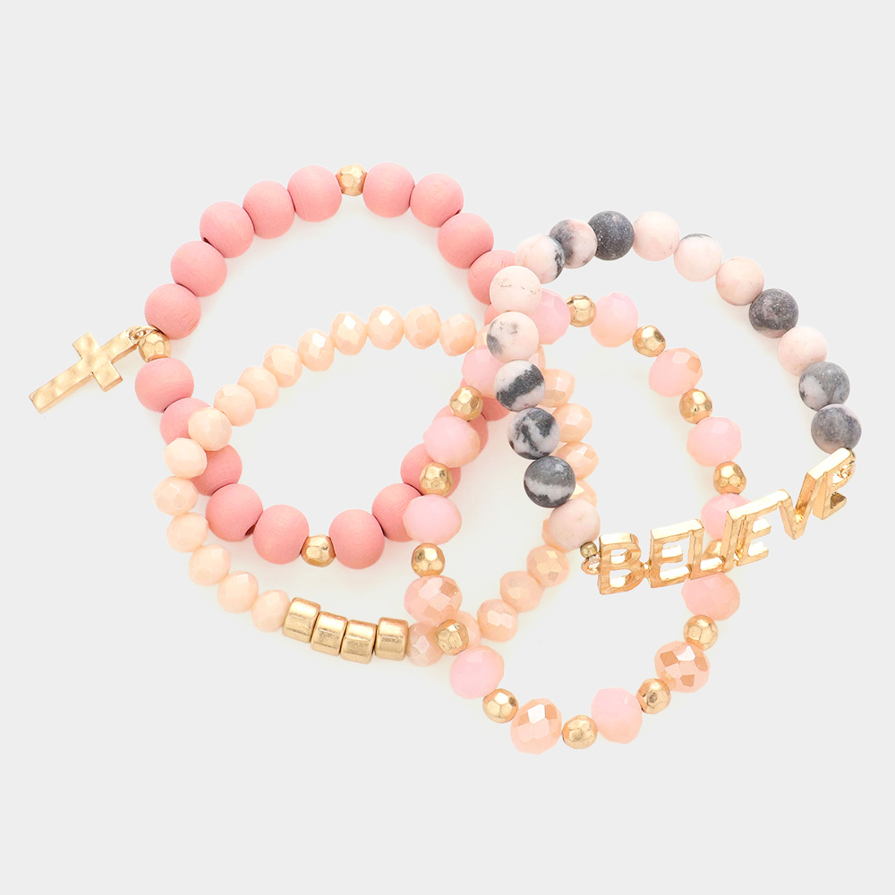 4PCS - Believe Message Cross Charm Semi Precious Wood Ball Faceted Beaded Stretch Bracelets