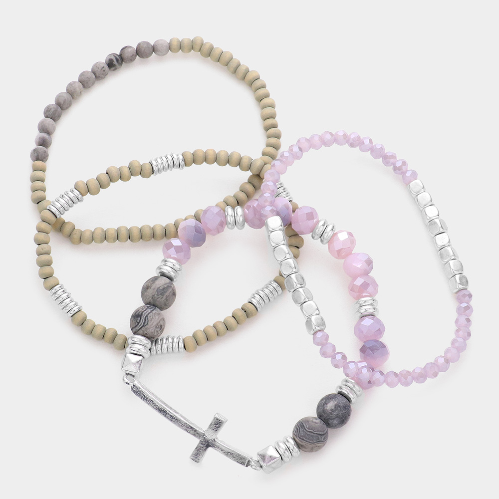 3PCS - Metal Cross Charm Pointed Metal Ball Beaded Stretch Multi Layered Bracelets