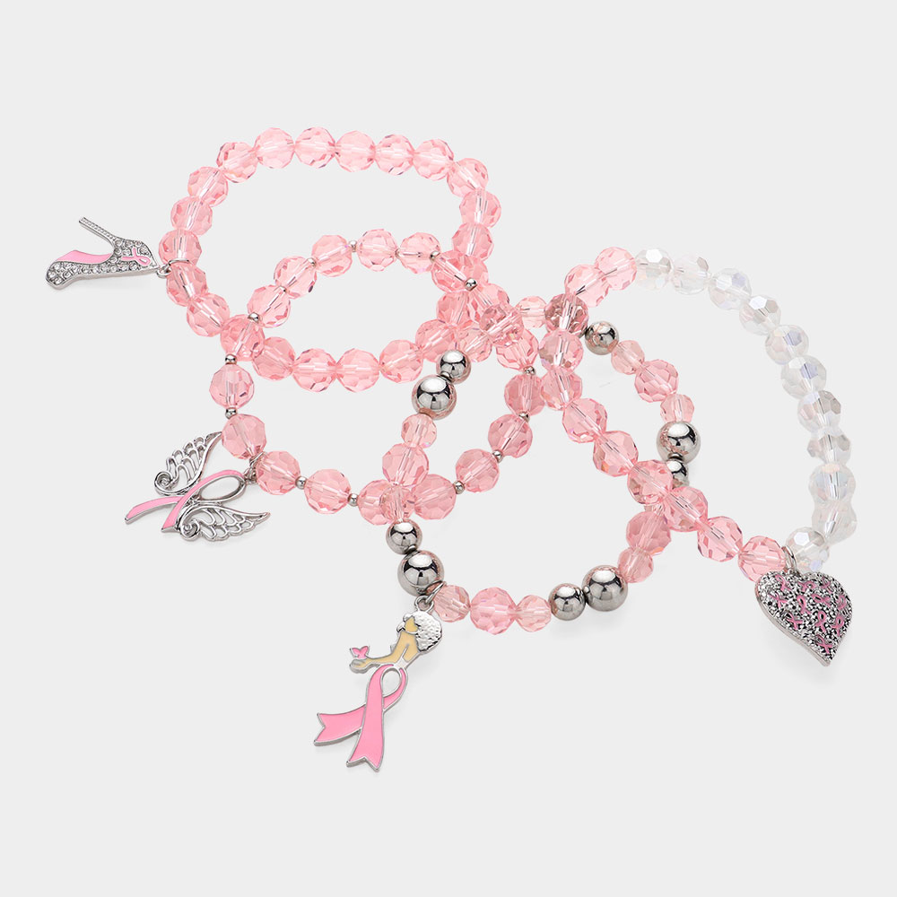 4PCS - Enamel Pink Ribbon Afro Woman High Heel Wing Heart Charm Faceted Beaded Stretch Multi Layered Bracelets