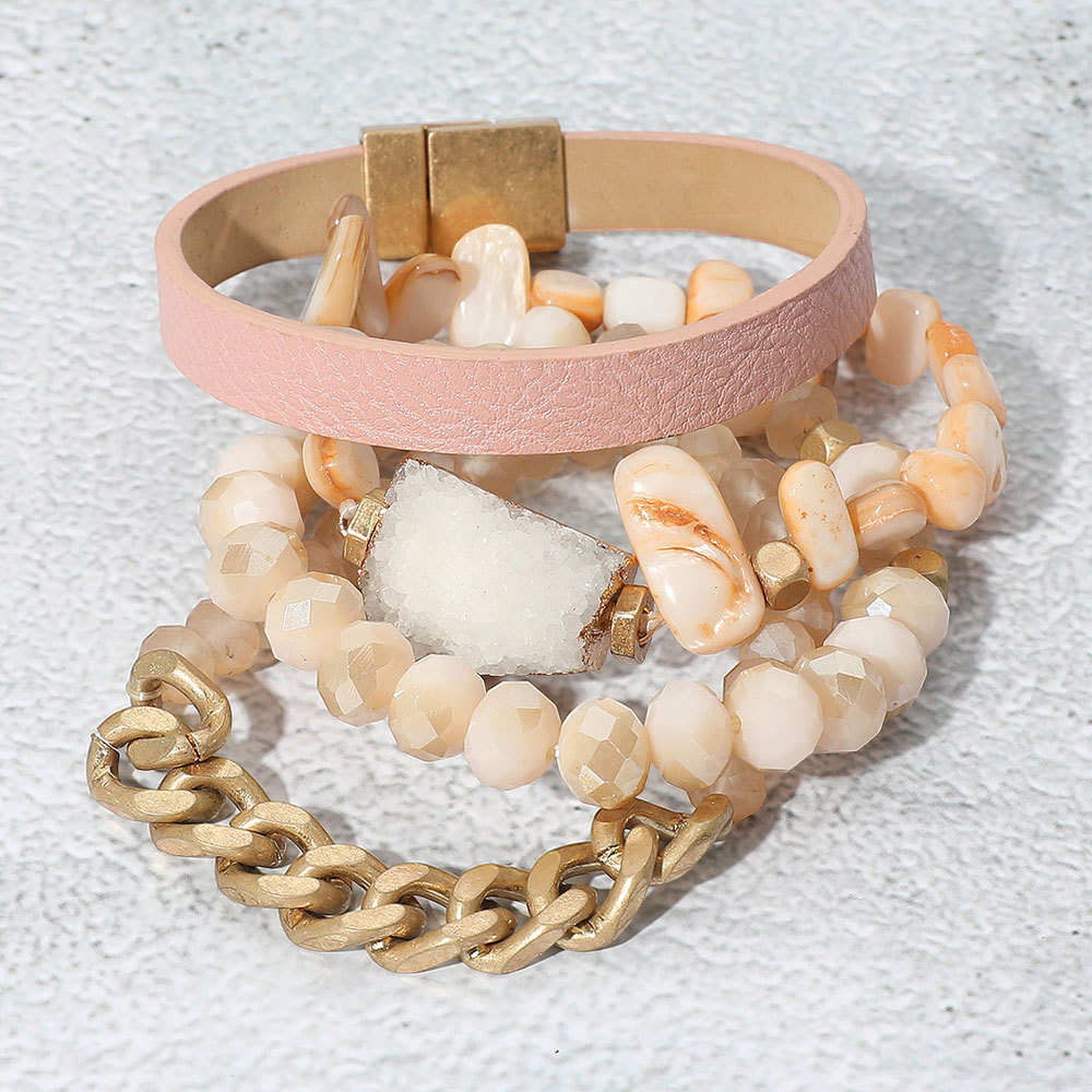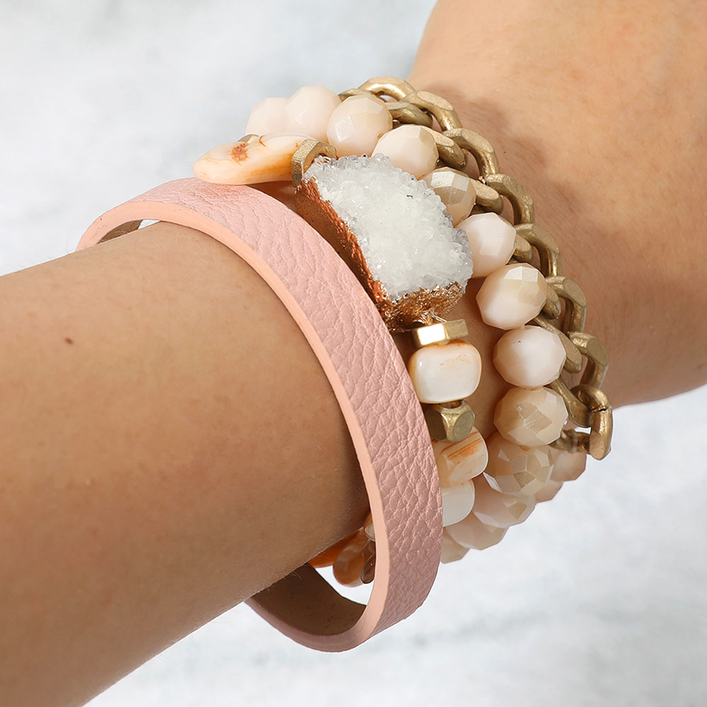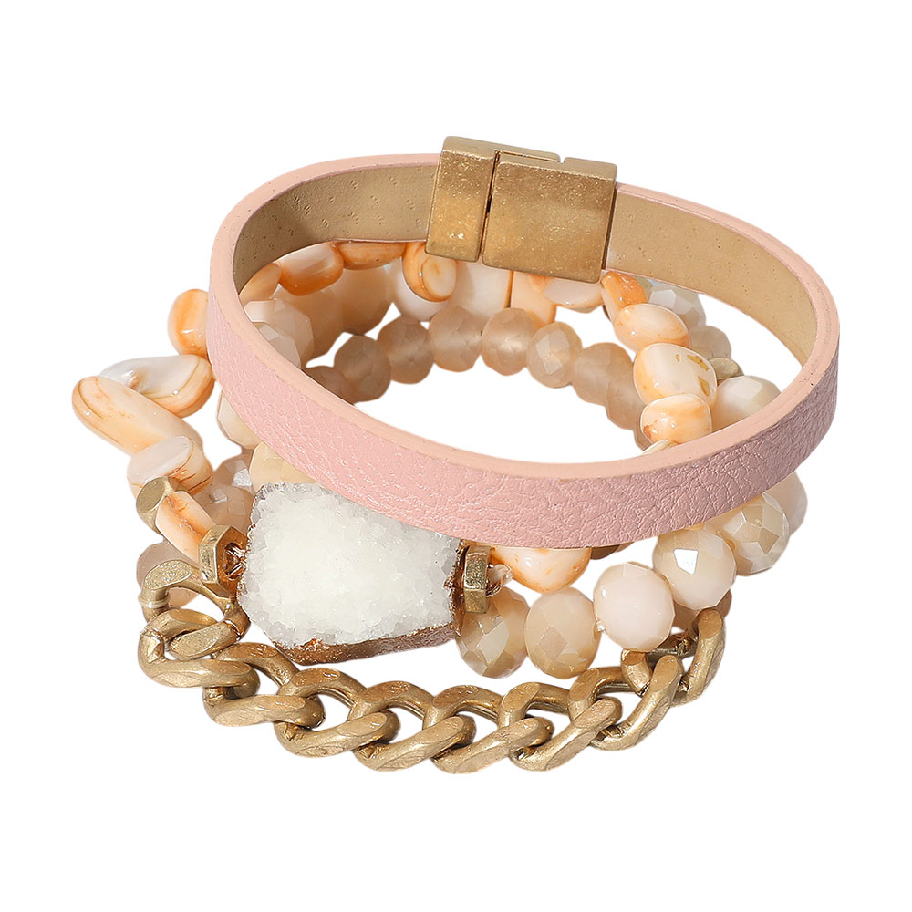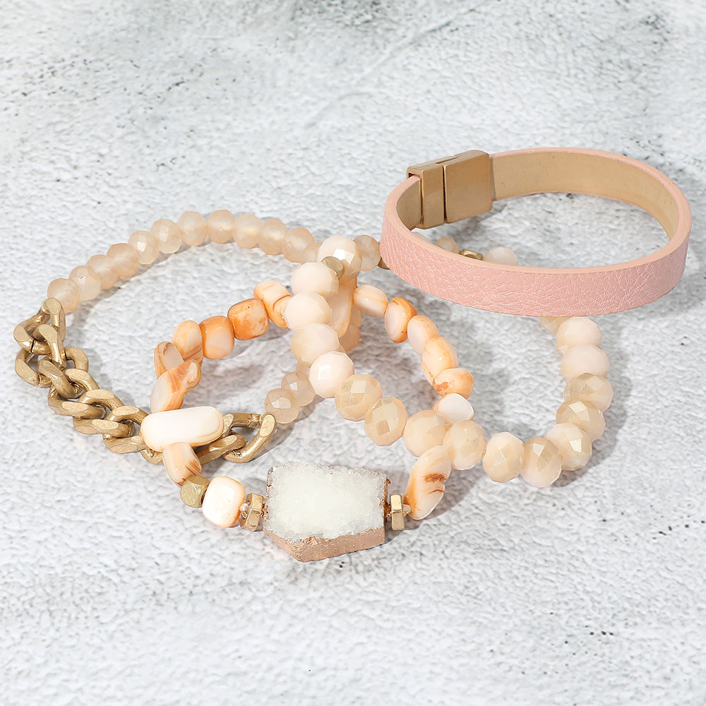 Details • Size : 2" H • Stretchable / Magnetic • Trendy 4-piece bracelet set featuring mixed beads, natural stone, faux leather band, and chain. Perfect for everyday wear or layered boho looks. Magnetic clasp for easy use. • Lead and Nickel Compliant