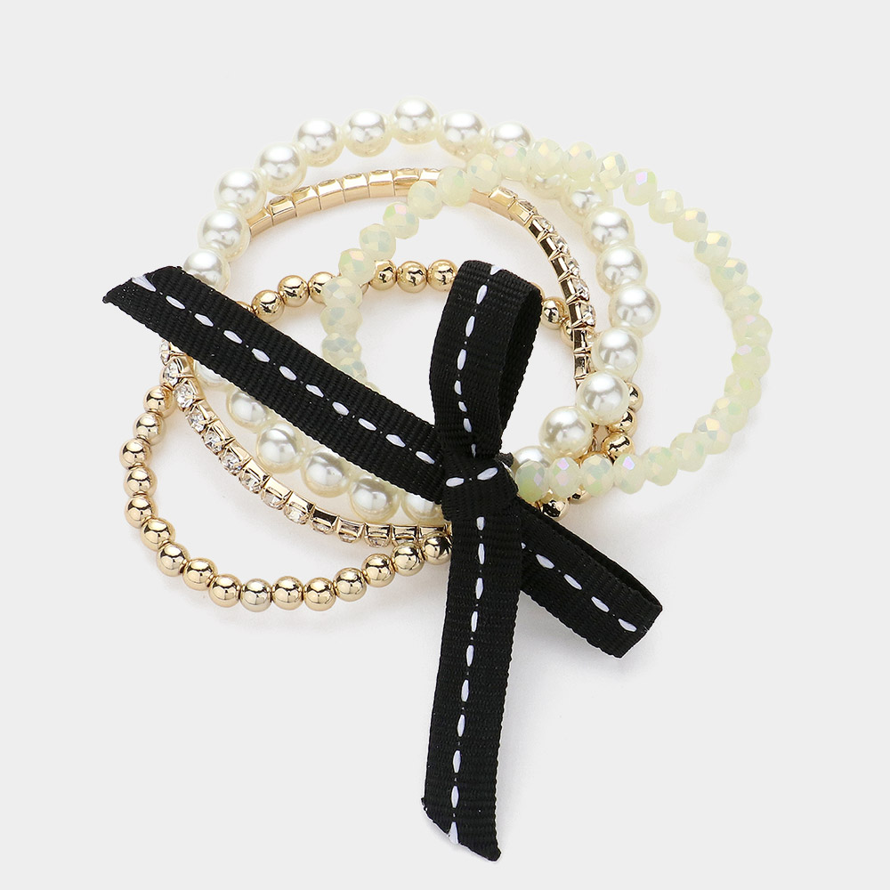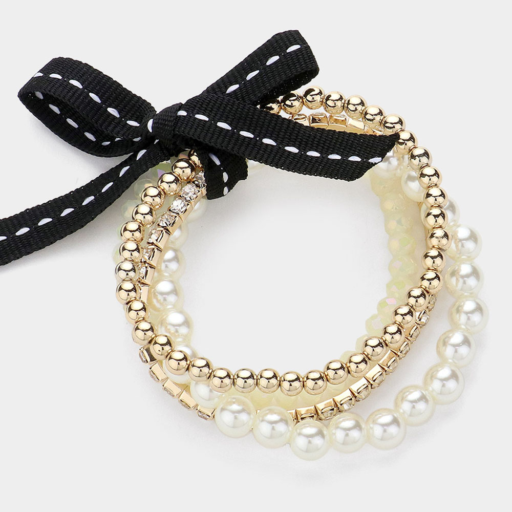 4PCS - Metal Ball Stone Cluster Faceted Beads Pearl Beaded Stretch Multi Layered Bracelets