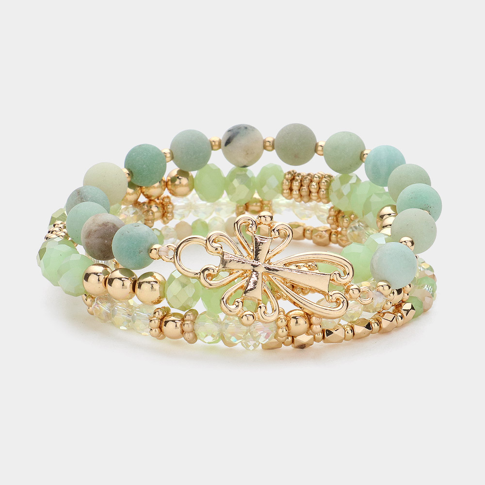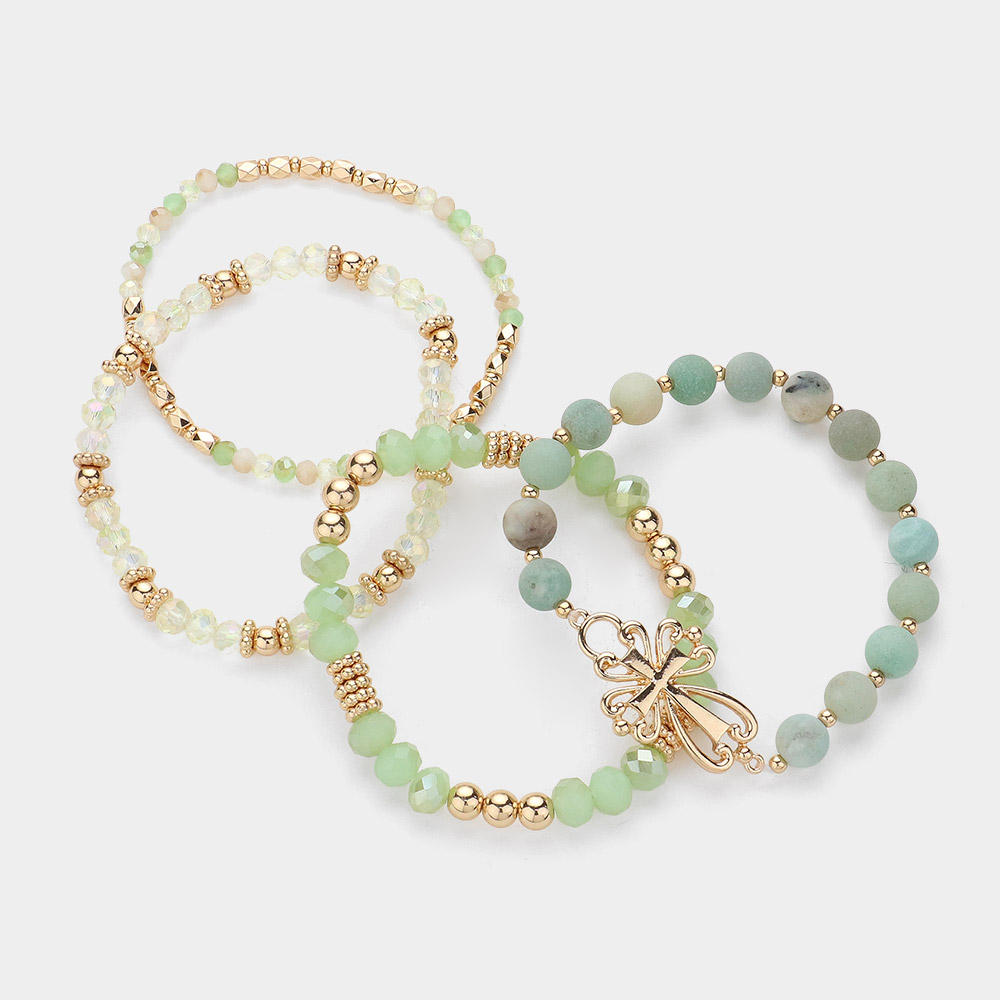 4PCS - Metal Cross Pendant Accented Faceted Beads Natural Stone Beaded Stretch Multi Layered Bracelets