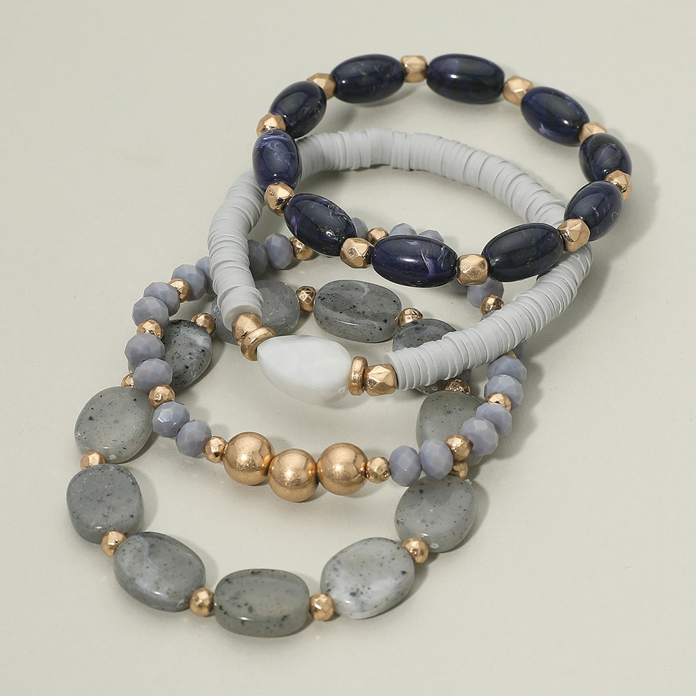Details • Size : 1.5" H • Stretchable • This layered stretch bracelet set features a unique mix of smooth, faceted, and textured beads combined with metallic accents. Designed for easy wear and versatile styling, this multi-strand bracelet stack adds a bold yet elegant finishing touch to casual and dressy looks. • Lead and Nickel Compliant