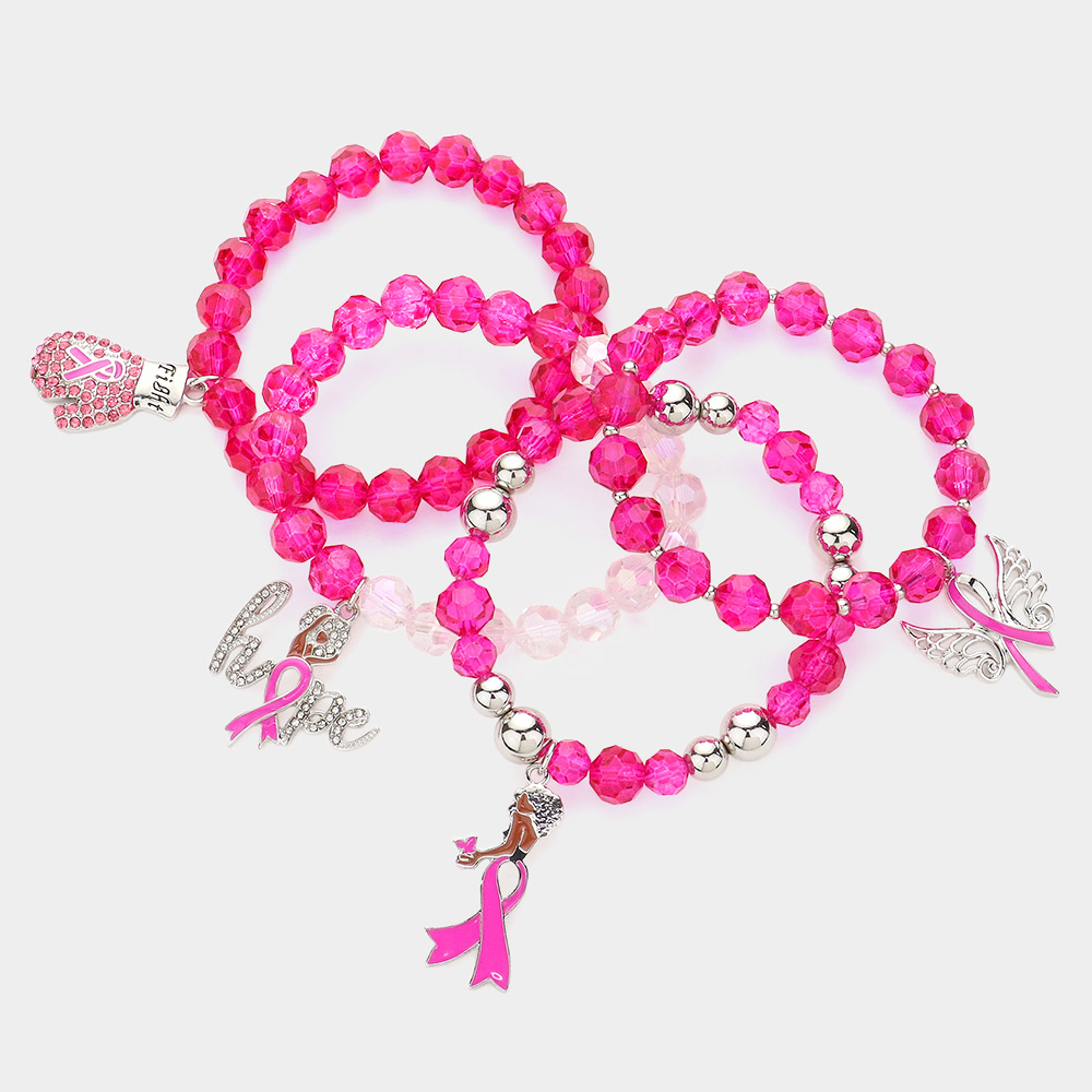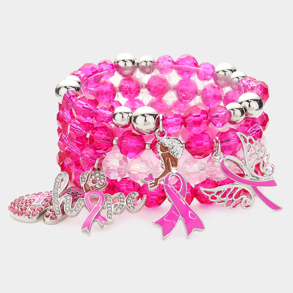 4PCS - Pink Ribbon Pointed Glove Afro Girl Angel Wing Hope Message Afro Girl Charm Faceted Beaded Stretch Bracelets