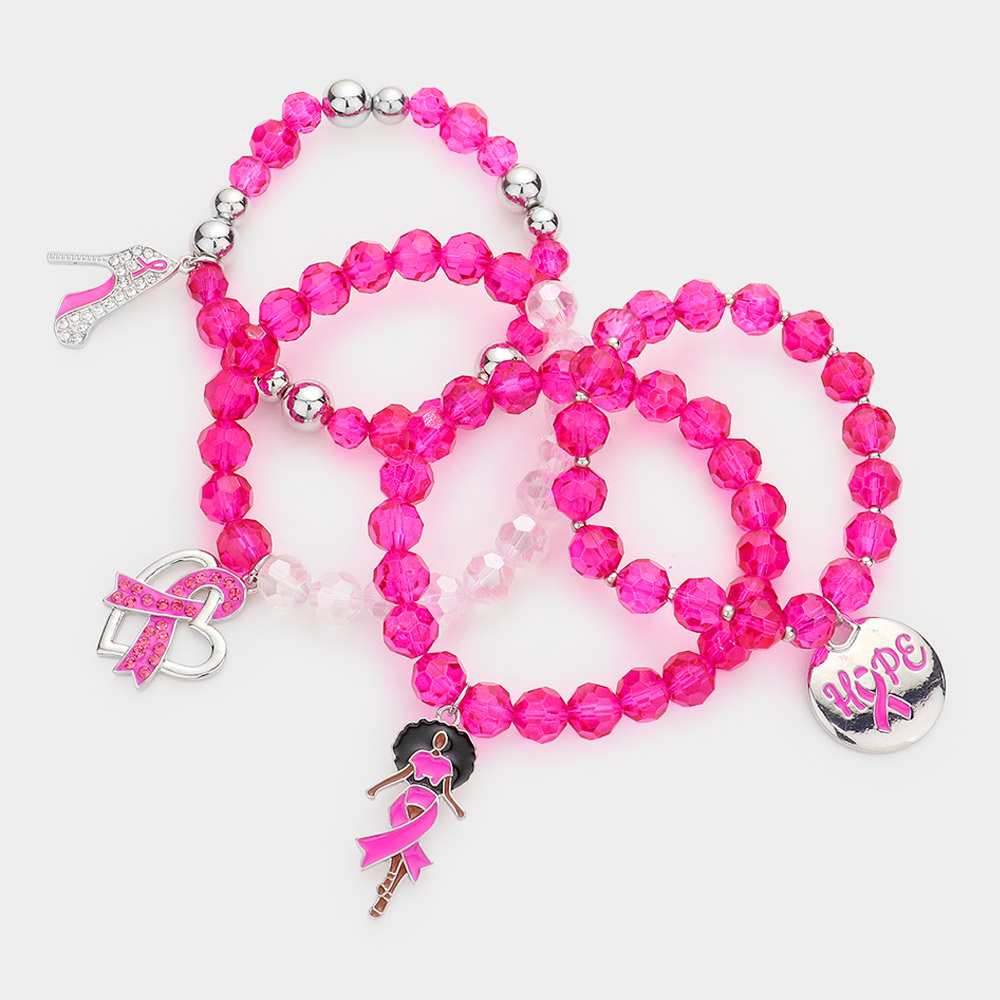 4PCS - Pink Ribbon Stiletto Heel Hope Message Afro Girl Charm Faceted Beaded Stretch Bracelets