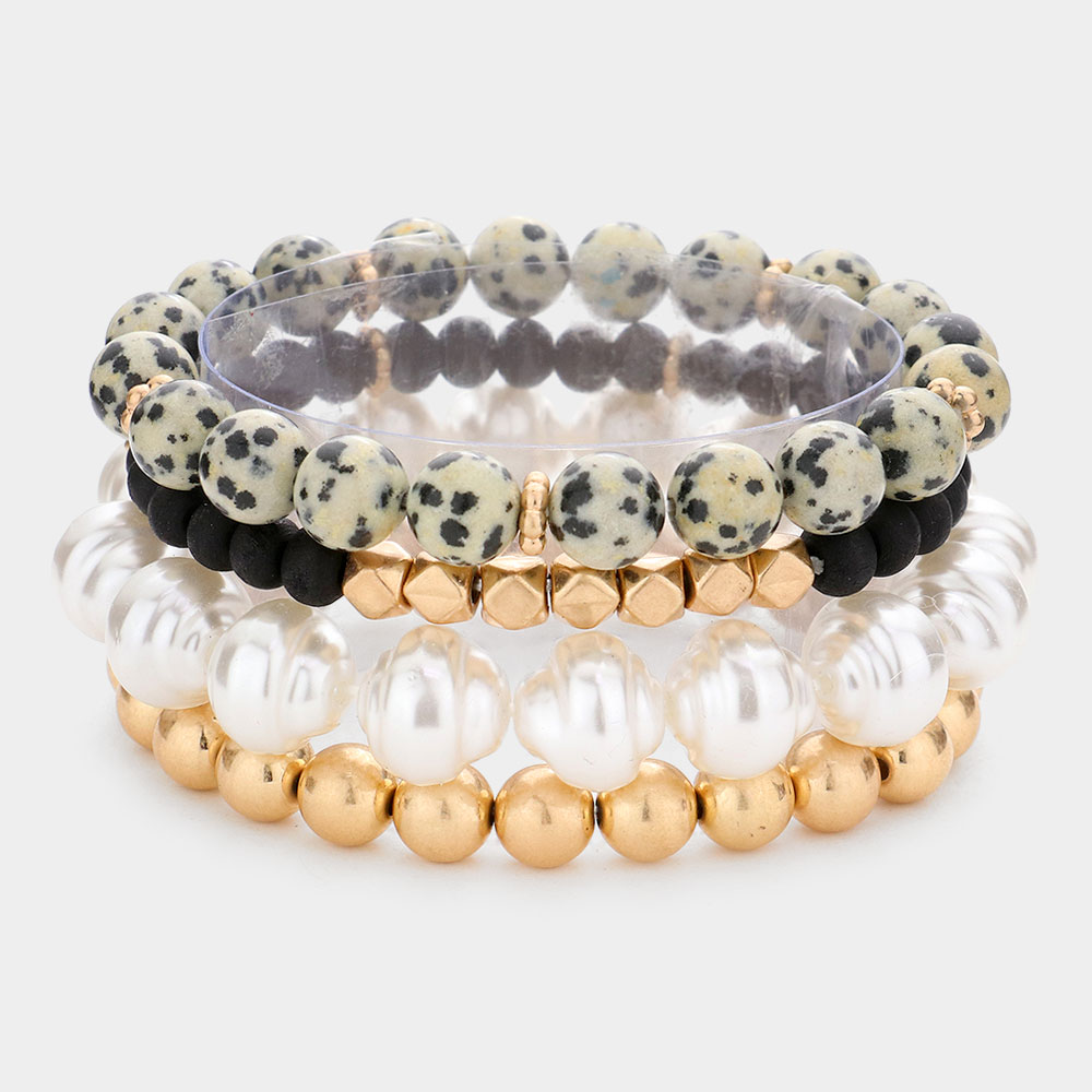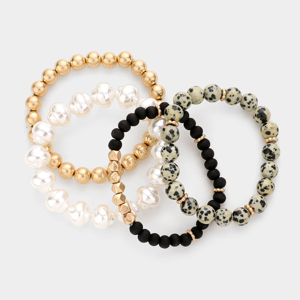 4PCS - Semi Precious Pearl Wood Beaded Stretch Bracelets