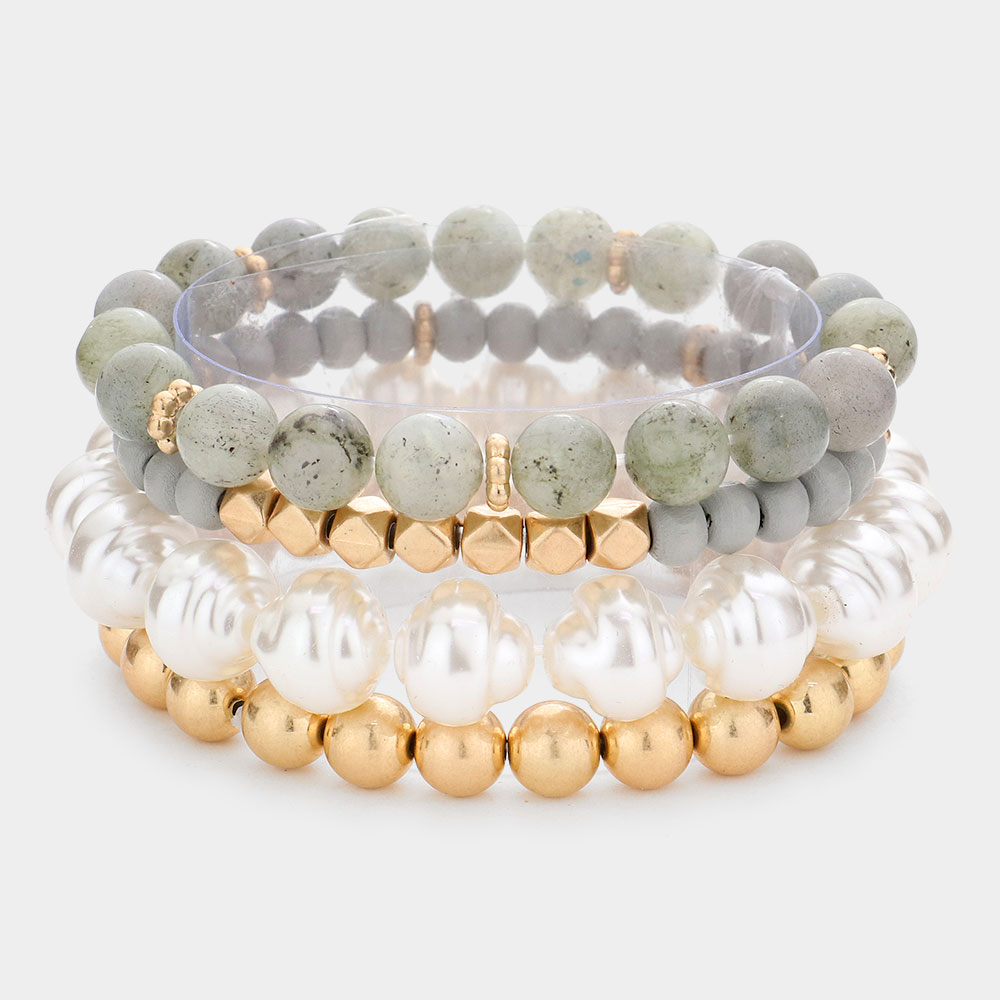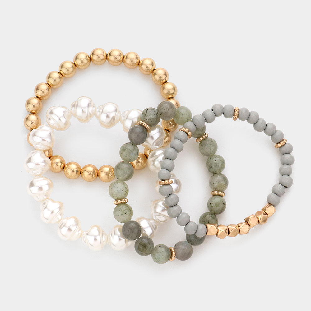 4PCS - Semi Precious Pearl Wood Beaded Stretch Bracelets