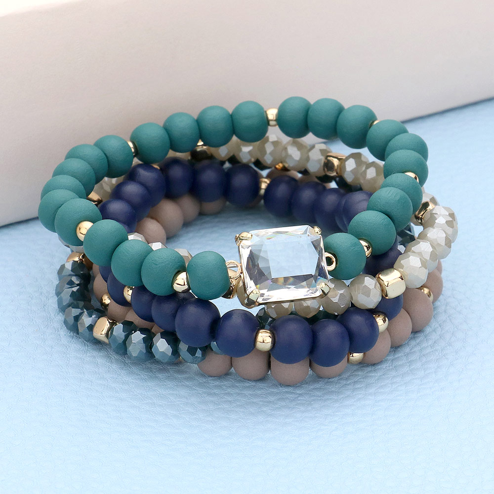 5PCS - Emerald Cut Stone Accented Wood Ball Faceted Beaded Stretch Bracelets