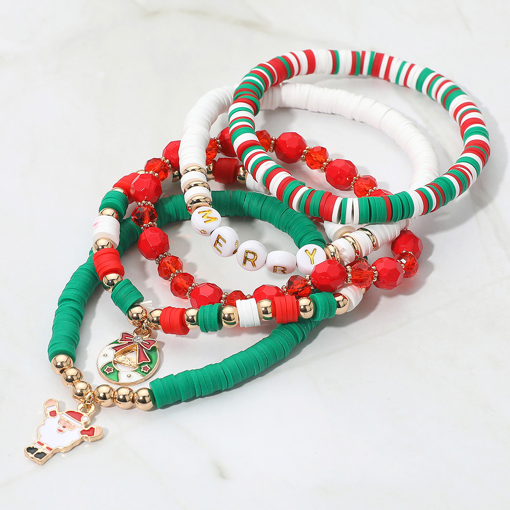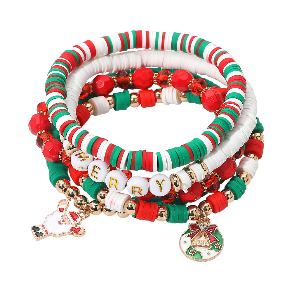 Details • Size : 2.25" H • Stretchable • Bring festive cheer with this Merry Christmas beaded bracelet set, designed in classic holiday colors with layered beads and playful charms like Santa and bells. A perfect seasonal accessory for parties, gifting, or daily holiday wear, adding sparkle and joy to your Christmas celebrations. • Lead and Nickel Compliant