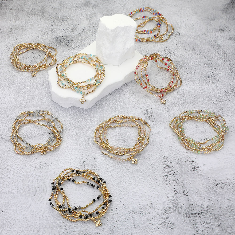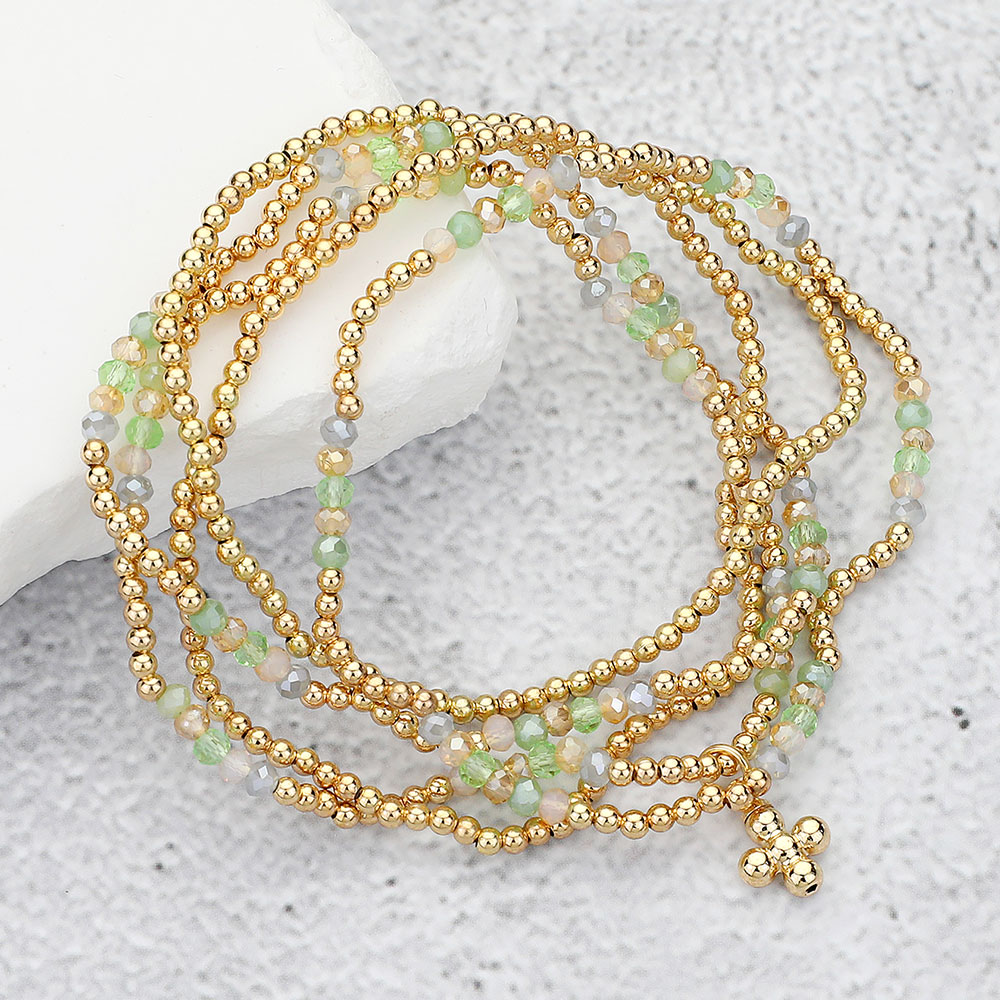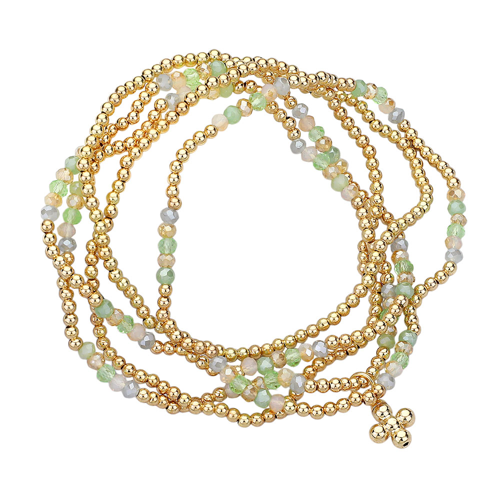 5PCS - Metal Bubble Flower Charm Accented Beaded Stretch Multi Layered Bracelets