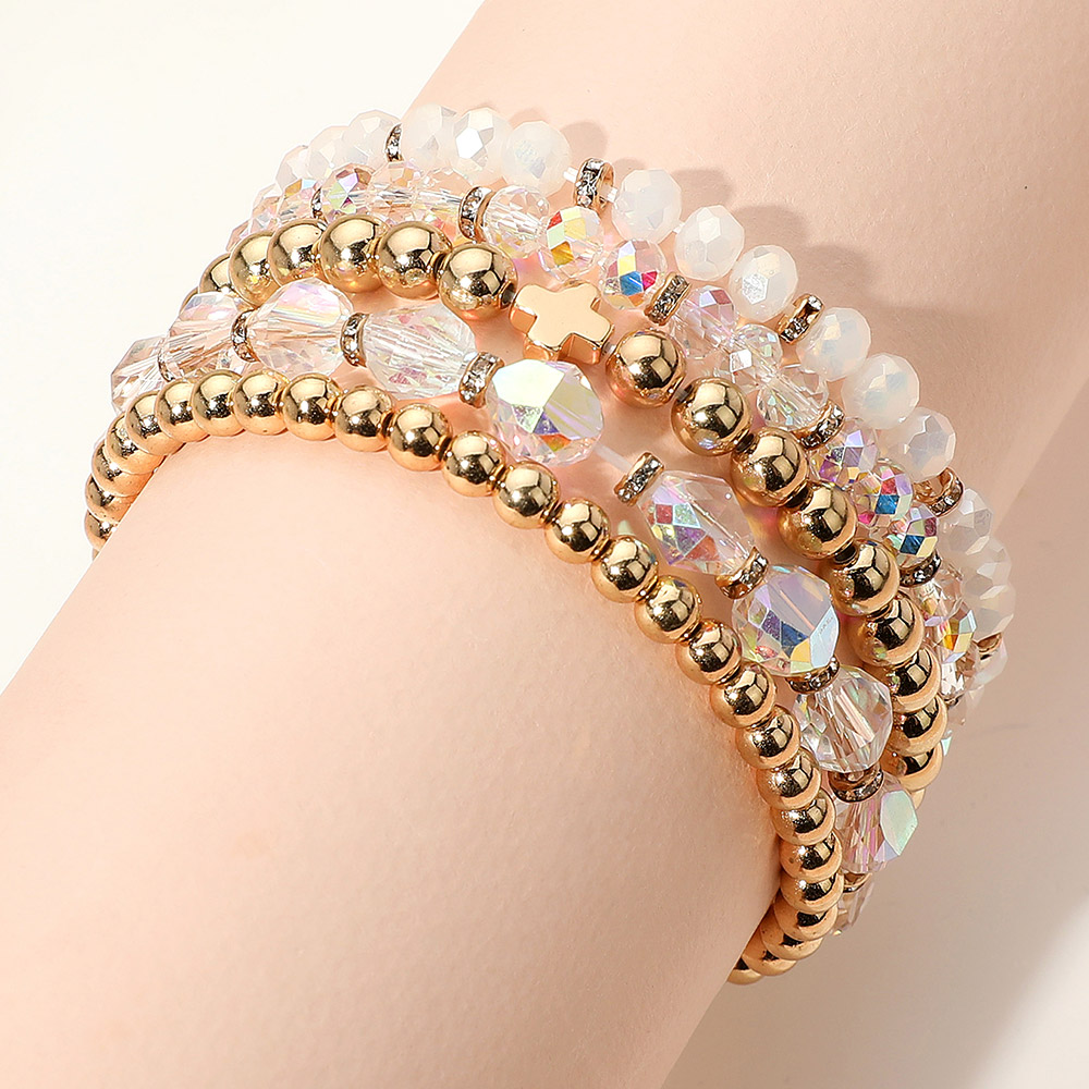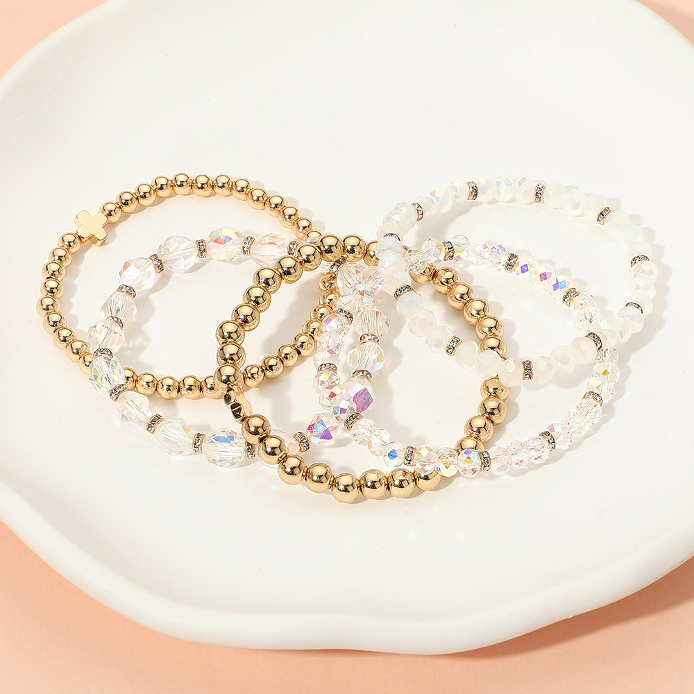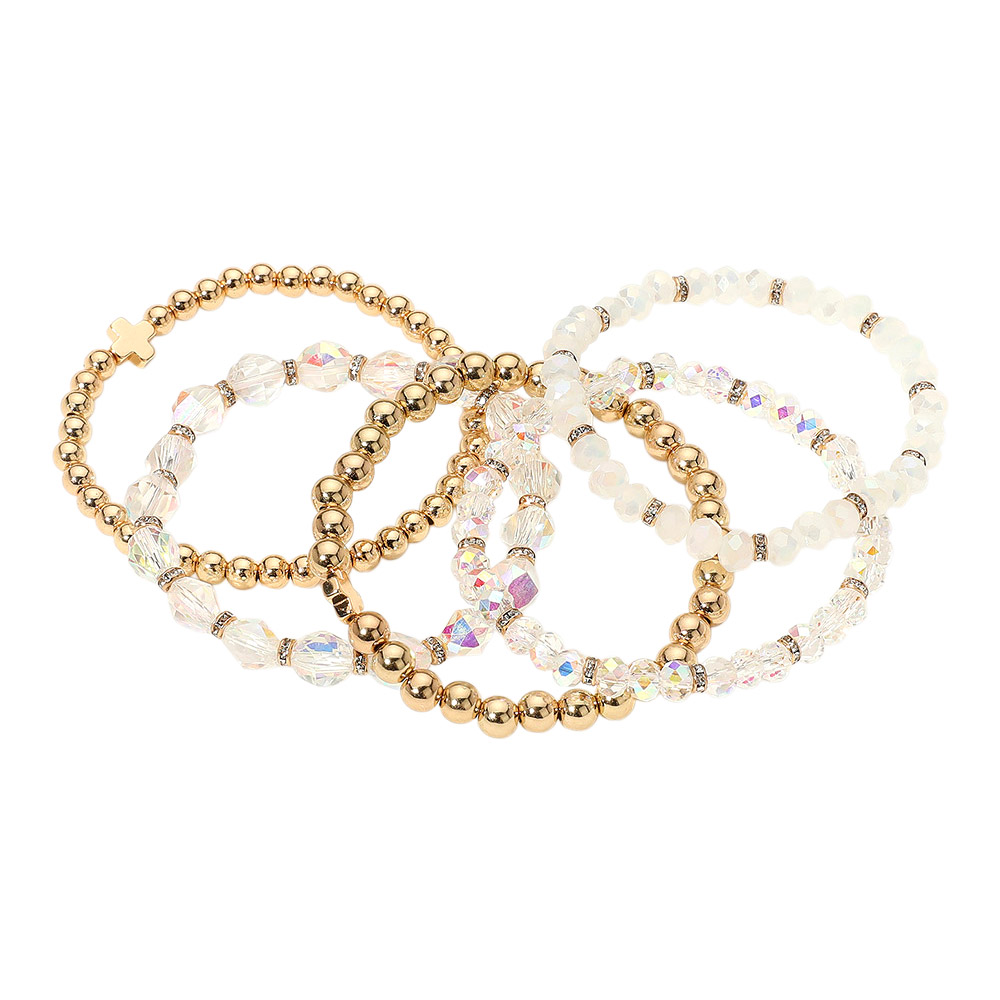 5PCS - Metal Cross Accent Faceted Beaded Stretch Multi Layered Bracelets
