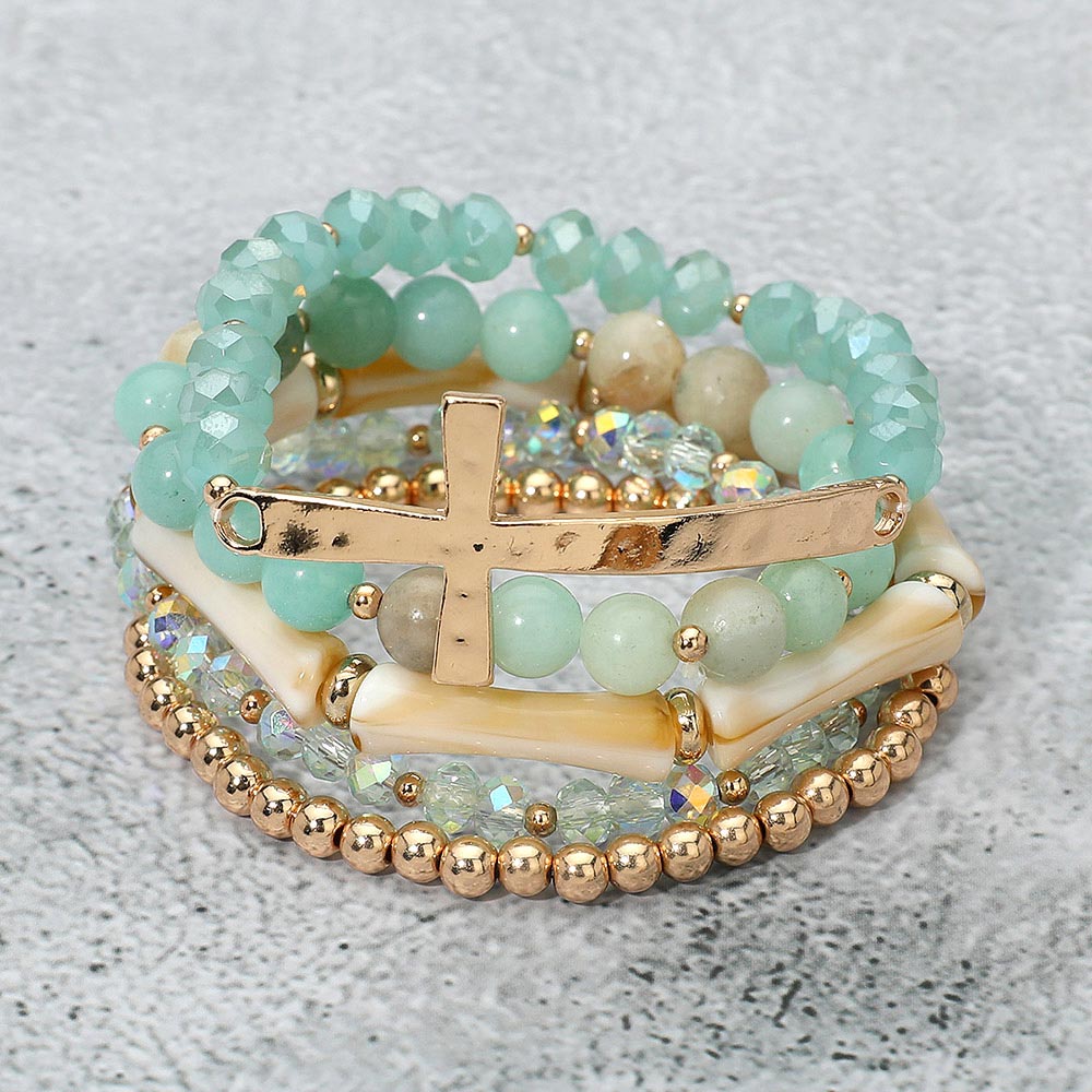 5PCS - Metal Cross Accent Resin Bamboo Bar Faceted Beaded Stretch Multi Layered Bracelets
