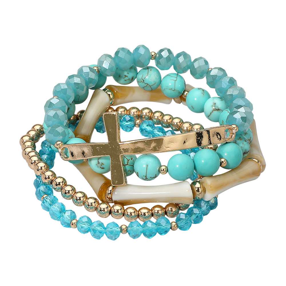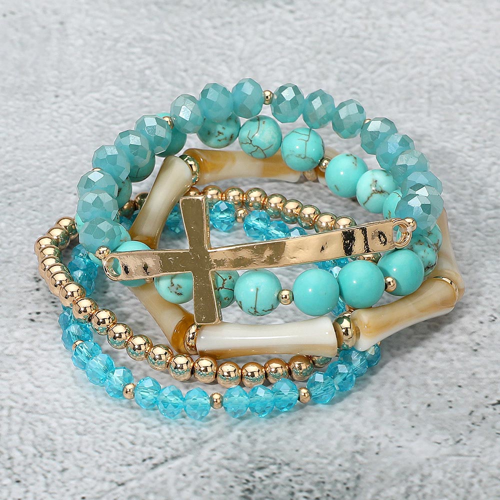 5PCS - Metal Cross Accent Resin Bamboo Bar Faceted Beaded Stretch Multi Layered Bracelets