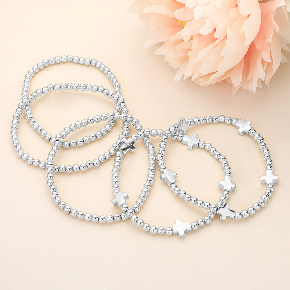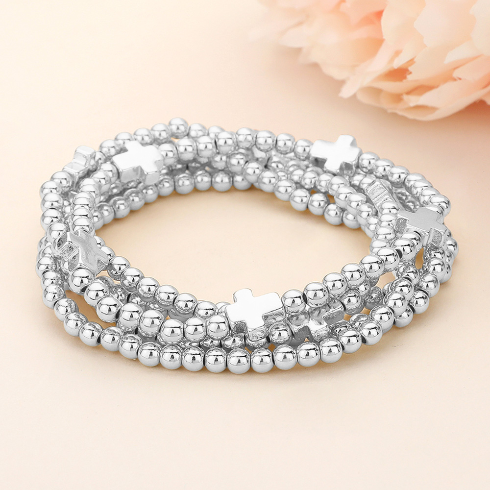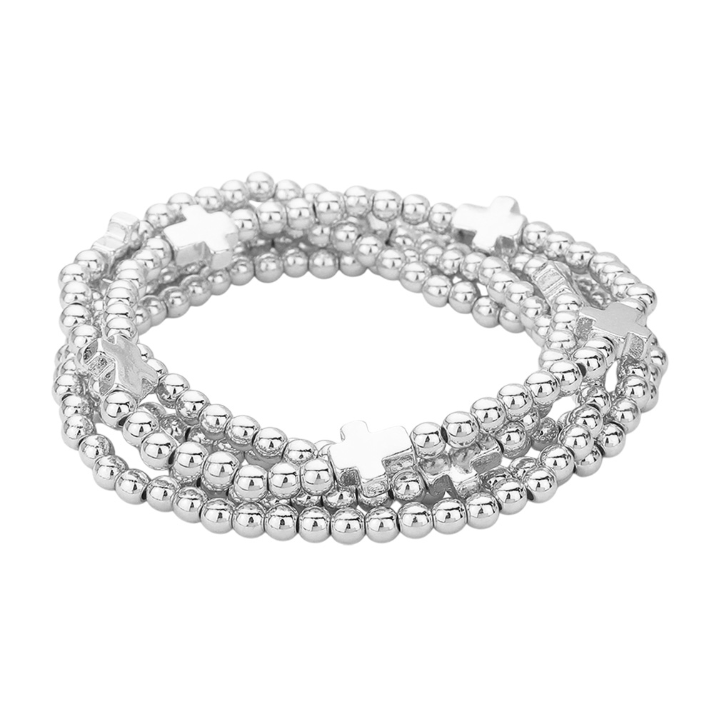 Details • Size : 1" H • Stretchable • Complete your accessories collection with this 5-piece beaded bracelet set adorned with polished beads and cross-shaped accents. Stretch design ensures comfort and versatility, perfect for stacking together or wearing individually for a chic and meaningful style that suits everyday or special occasions. • Lead and Nickel Compliant