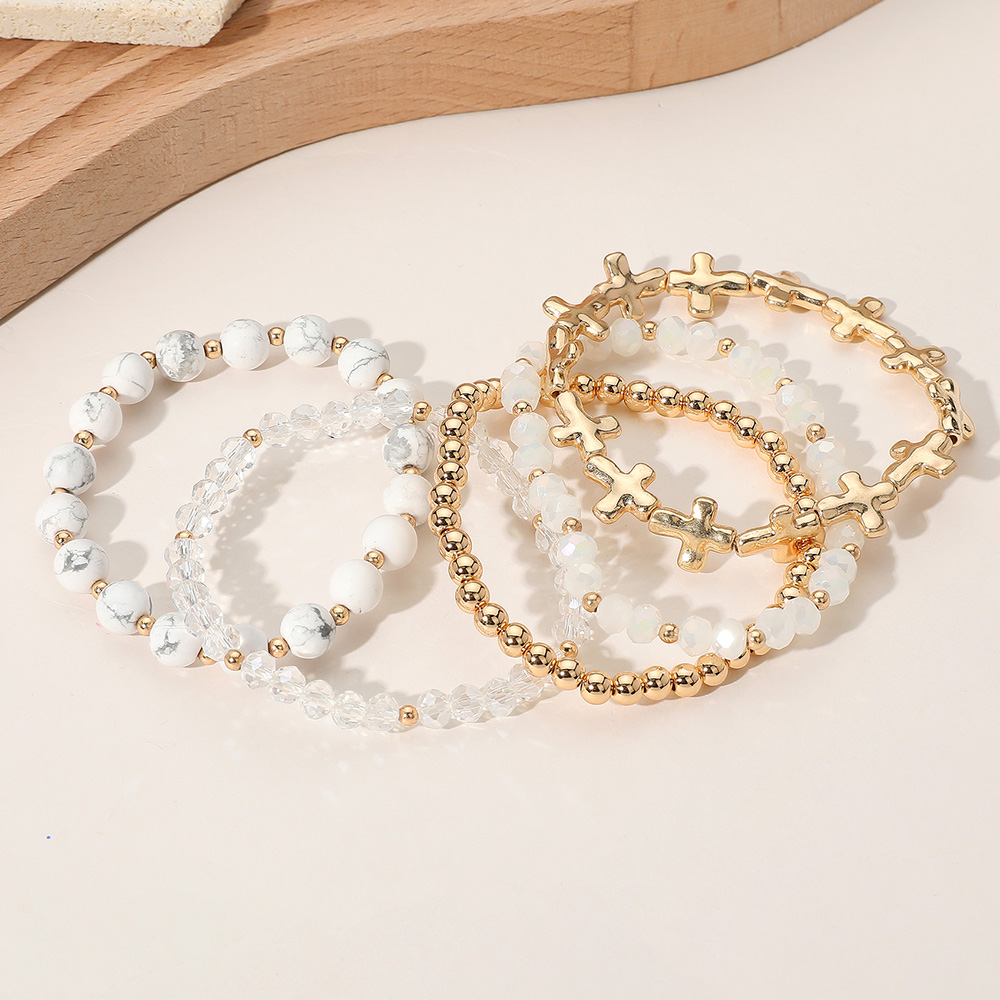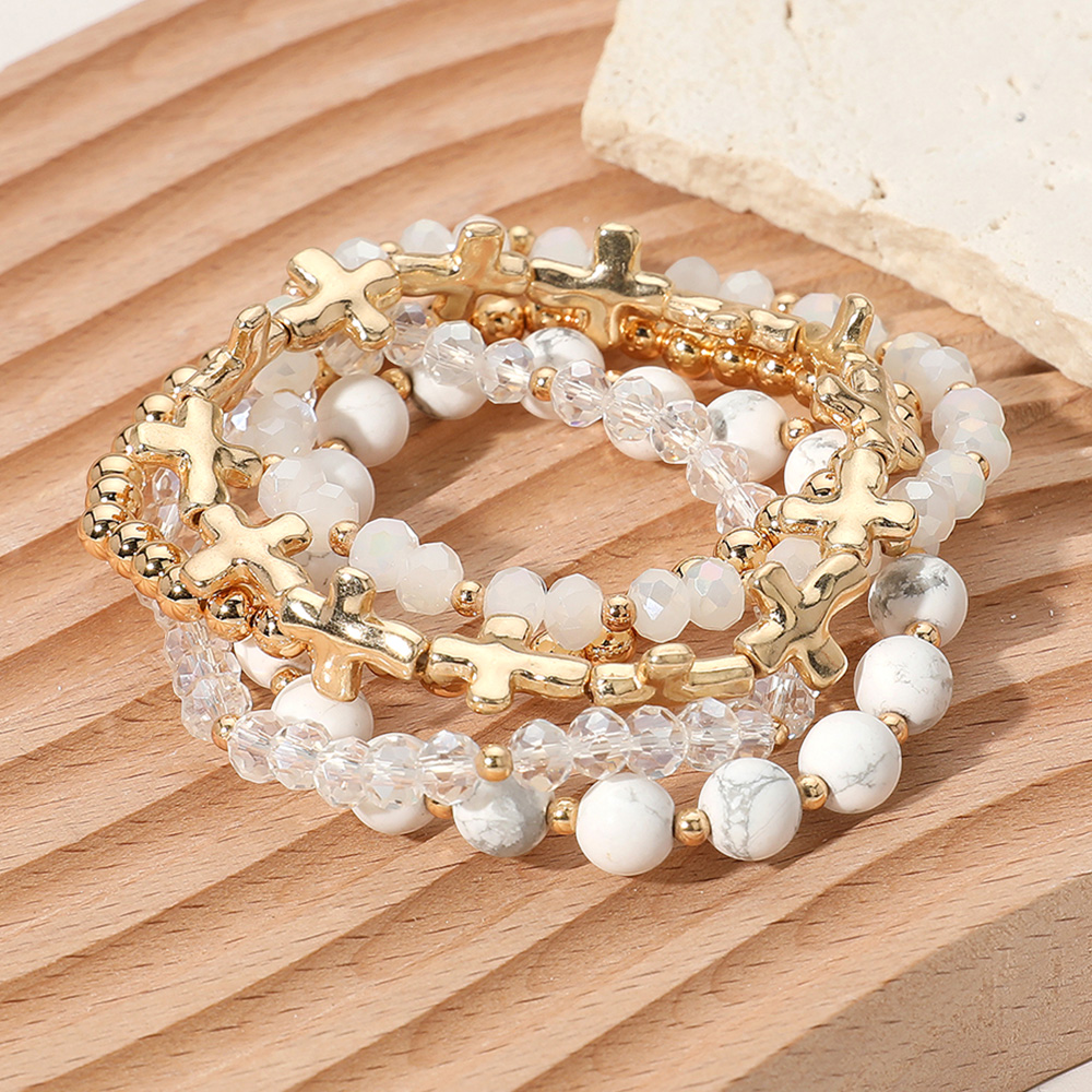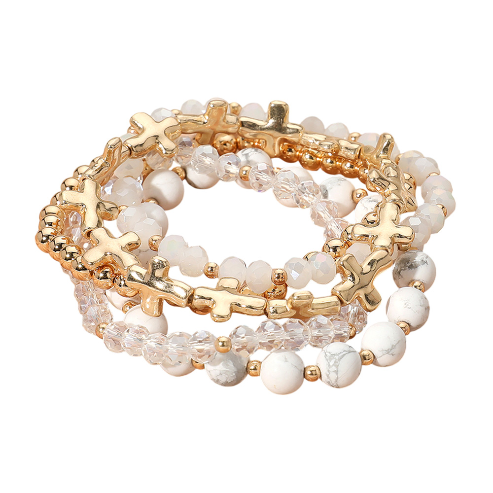 5PCS - Metal Cross Natural Stone Faceted Beaded Stretch Multi Layered Bracelets