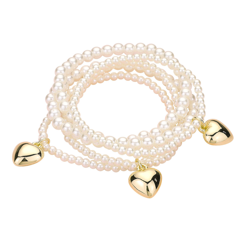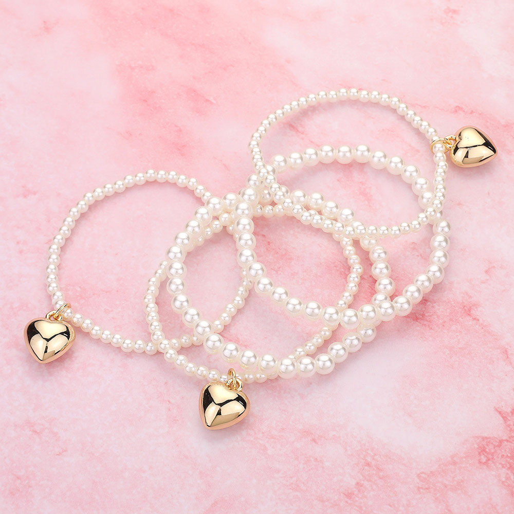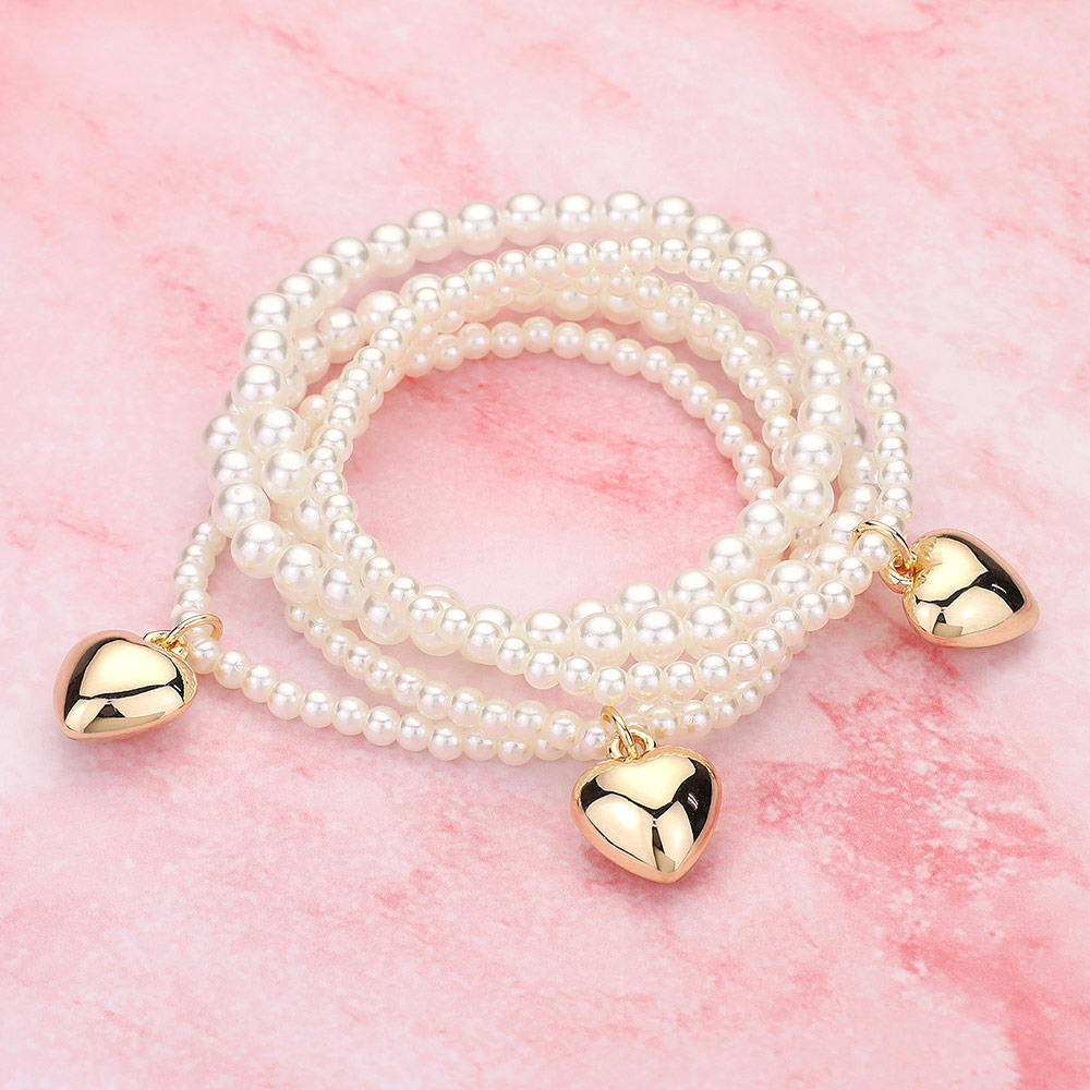 5PCS - Metal Heart Charm Pearl Beaded Stretch Multi Layered Bracelets