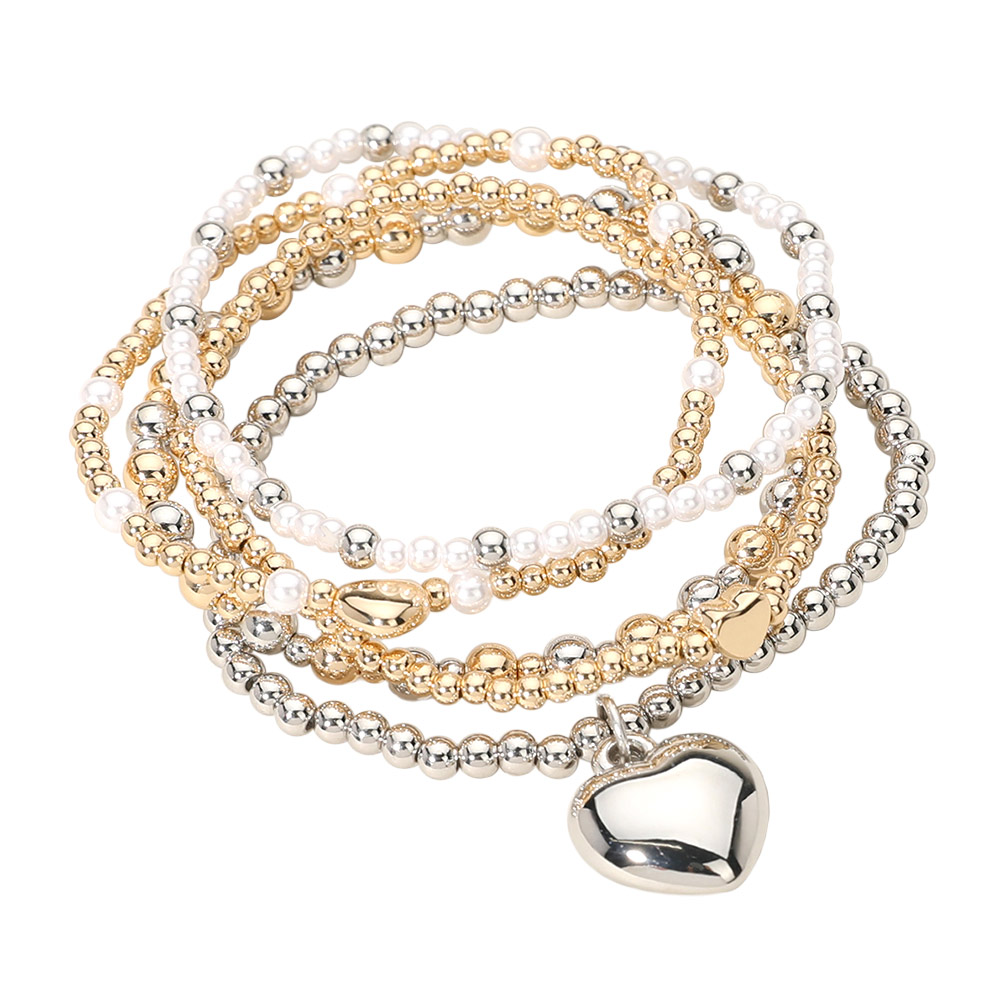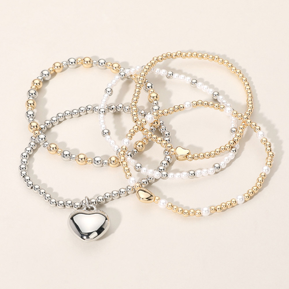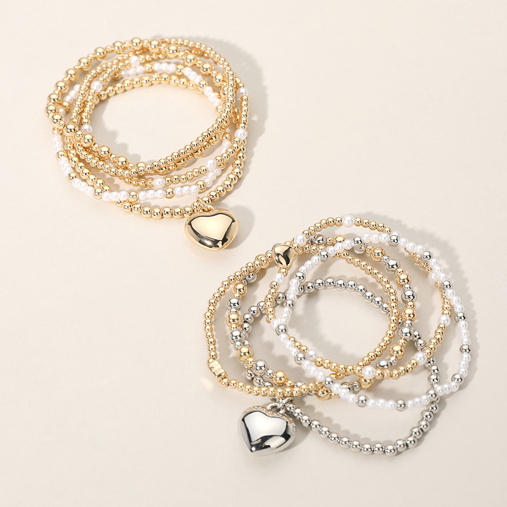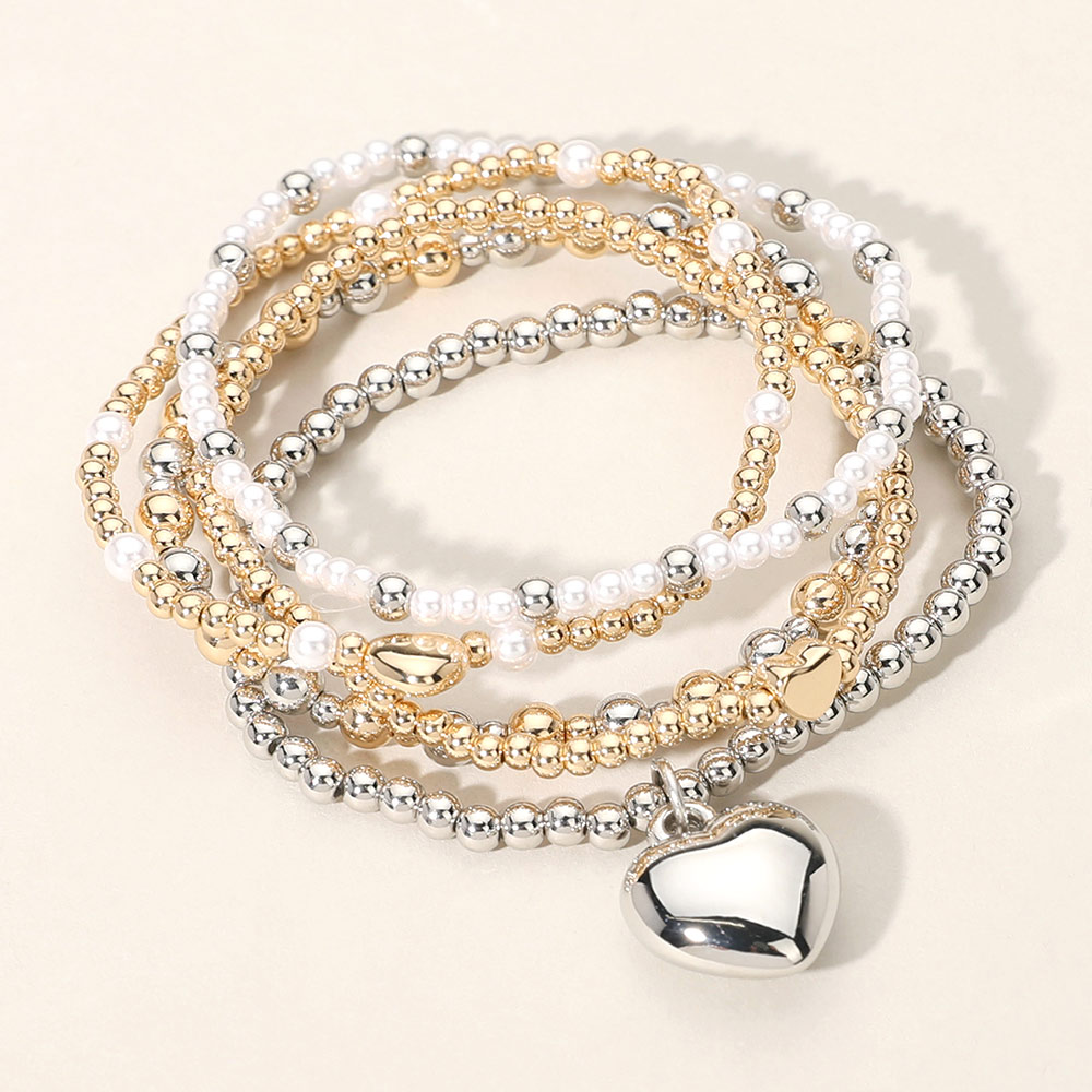 5PCS - Metal Heart Charm Pointed Ball Pearl Beaded Stretch Multi Layered Bracelets