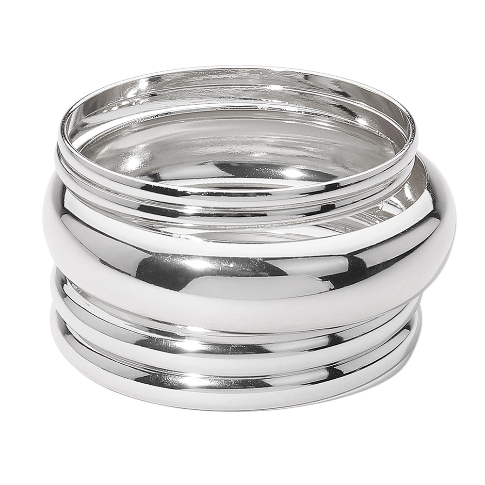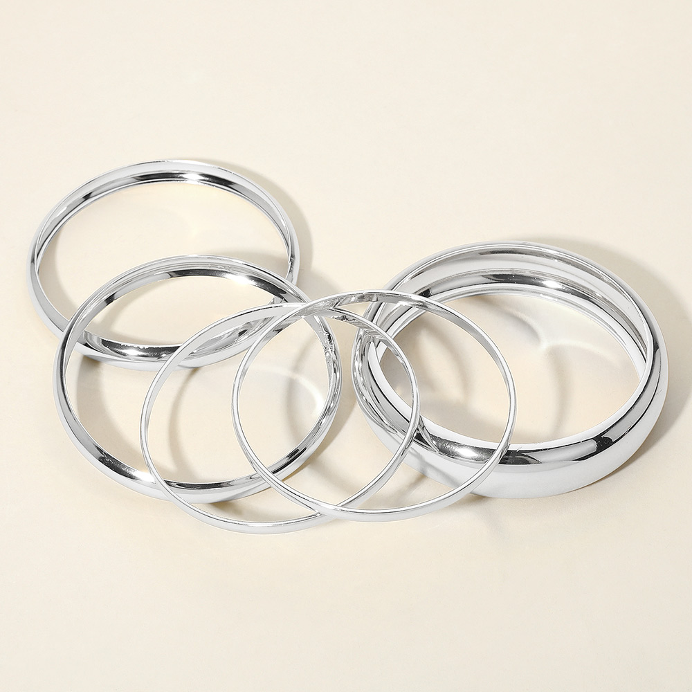Details • Size : 1.75" H, 2.6" D • Make a chic statement with this stacked bangle bracelet set, designed with a mix of wide and sleek bands for a modern layered effect. Perfect for dressing up casual looks or adding a bold touch to evening outfits, this set brings timeless style to any collection. • Lead and Nickel Compliant