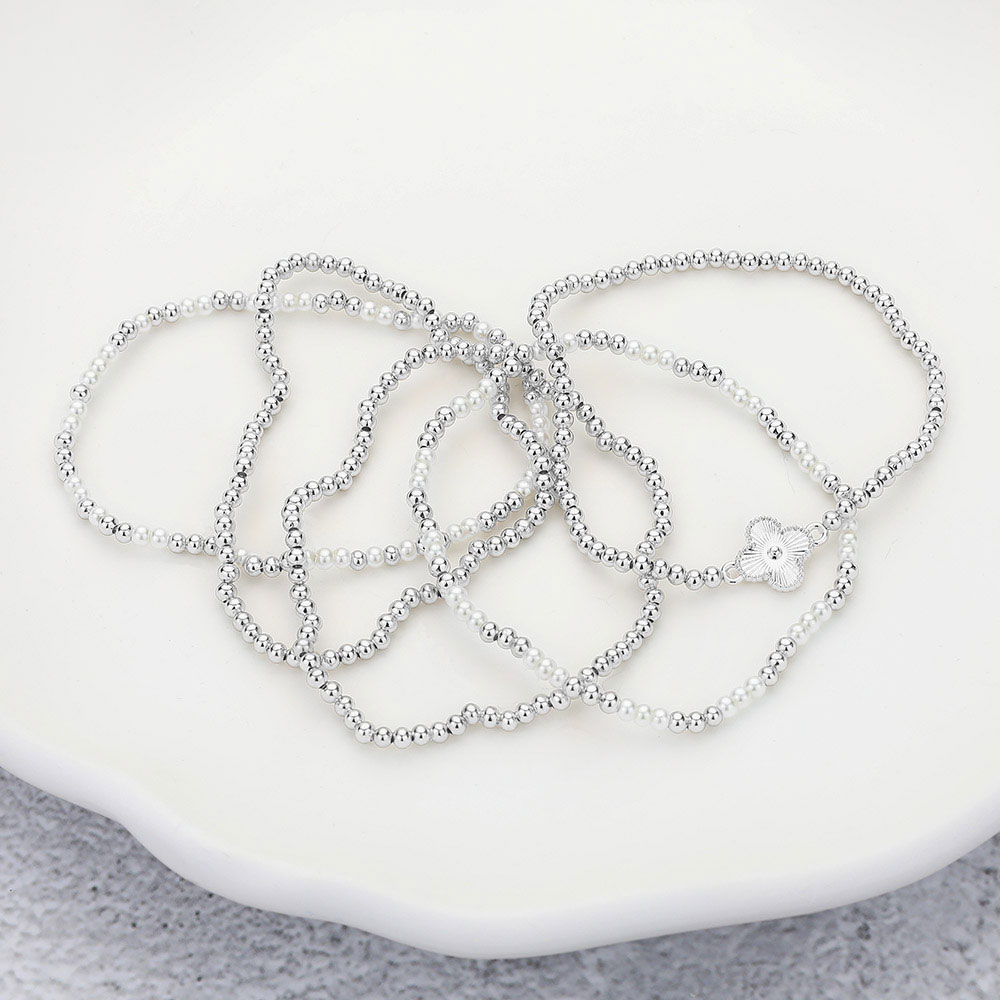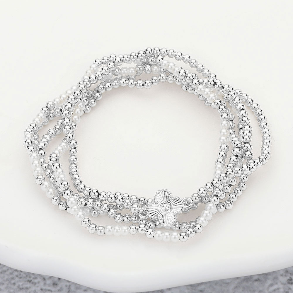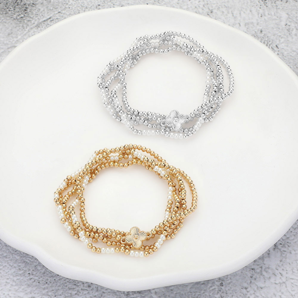 3PCS - Quatrefoil Pearl Beaded Stretch Multi Layered Bracelets