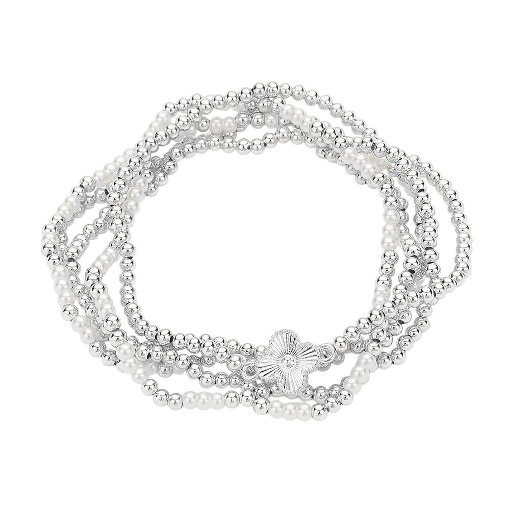 5PCS - Metal Quatrefoil Pointed Pearl Beaded Stretch Multi Layered Bracelets