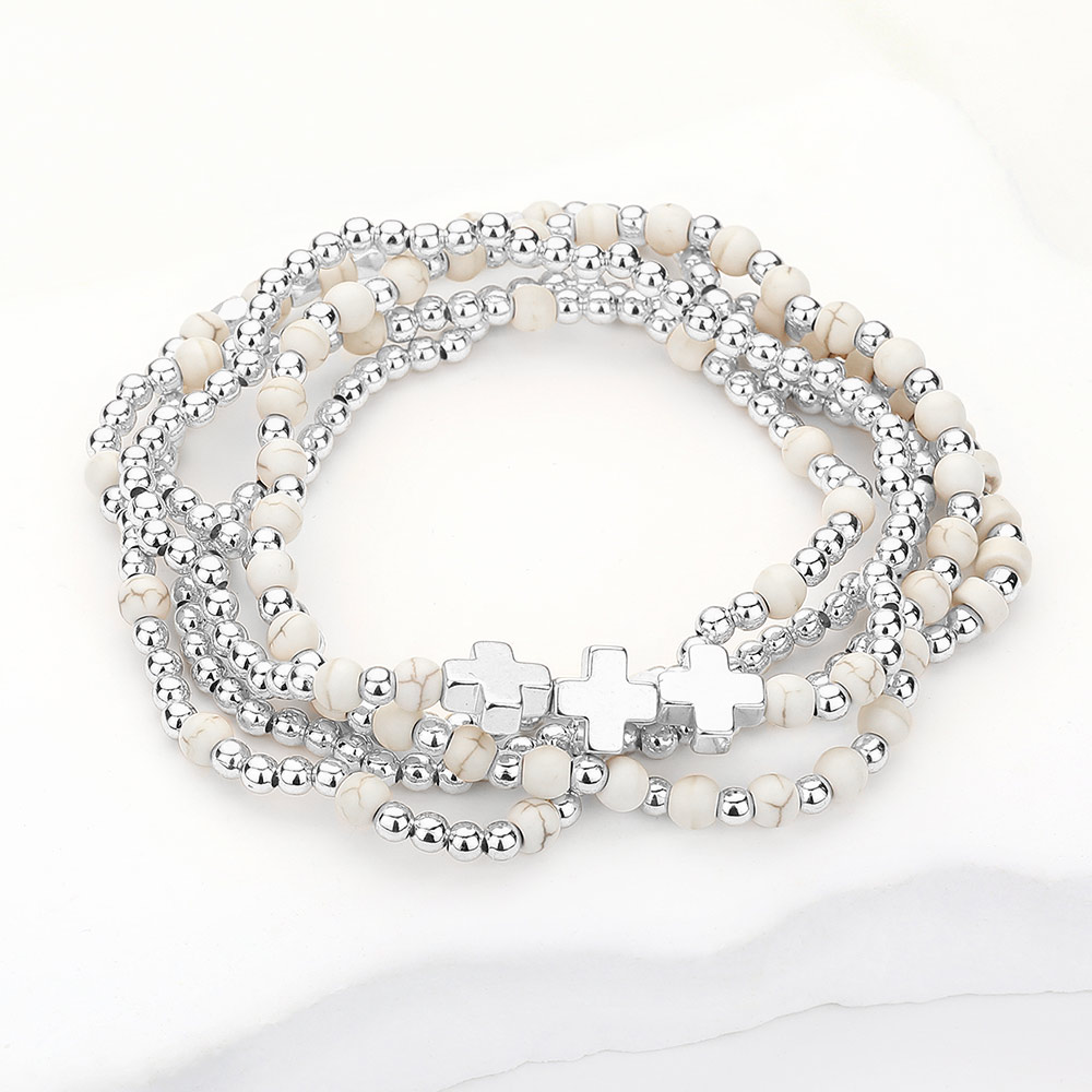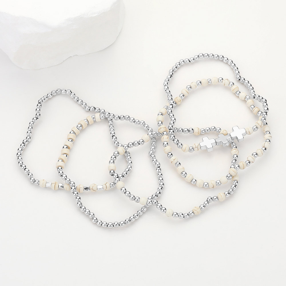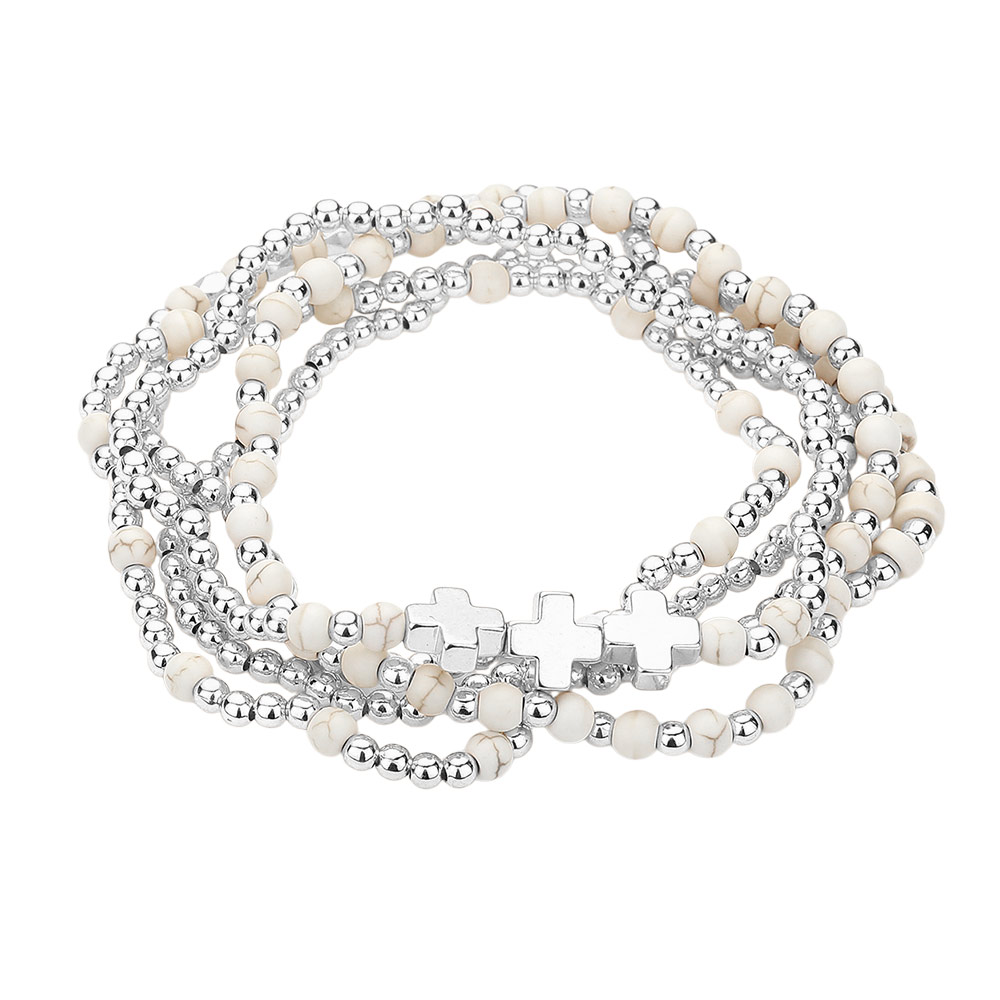 5PCS - Natural Stone Metal Cross Ball Beaded Stretch Multi Layered Bracelets