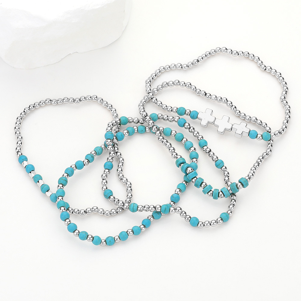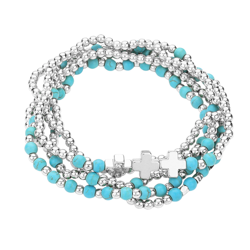 Turquoise Stone Accented Antique Metal Cross Metal Ball Beaded Triple Layered Stretch Bracelet