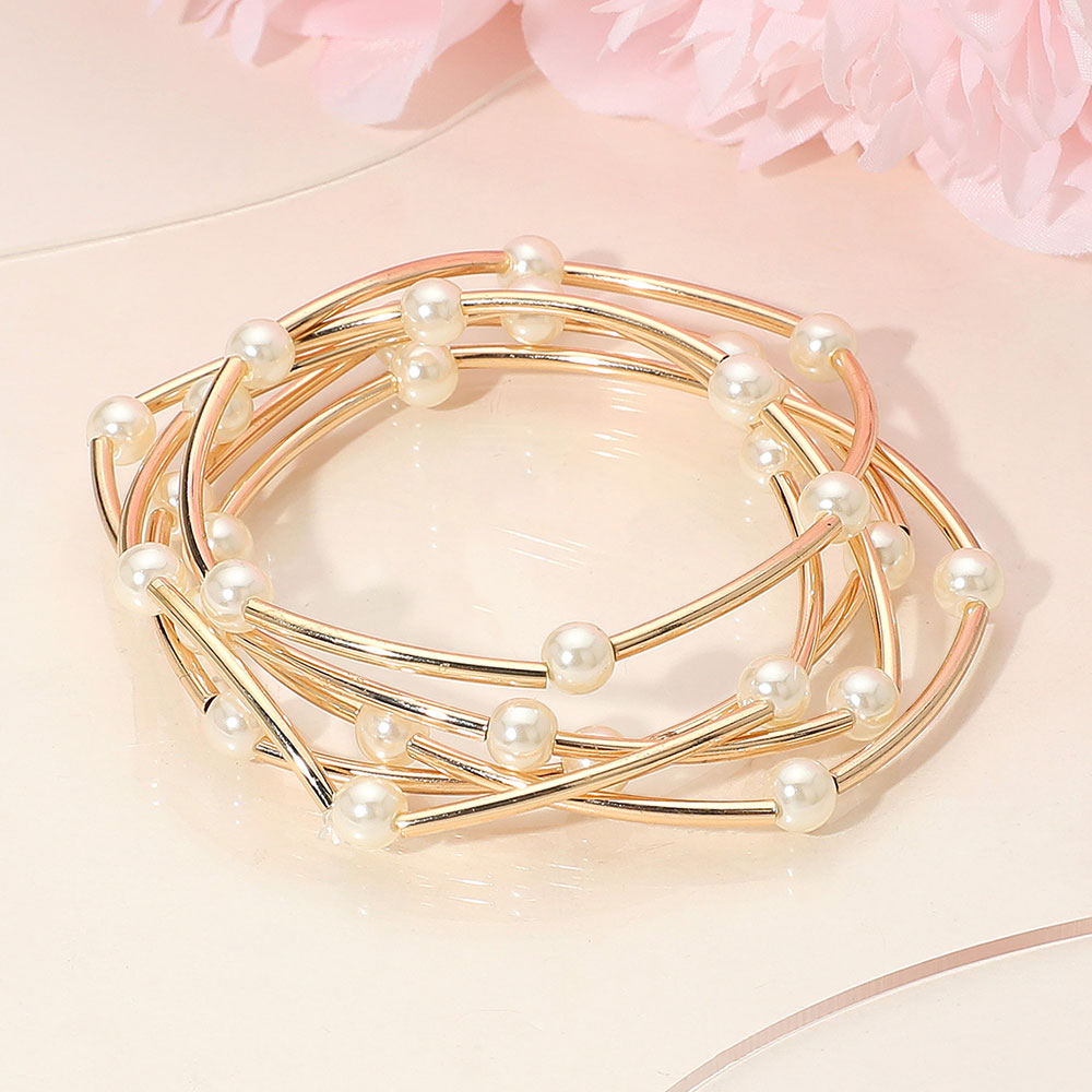 5PCS - Pearl Metal Bar Beaded Stretch Multi Layered Bracelets