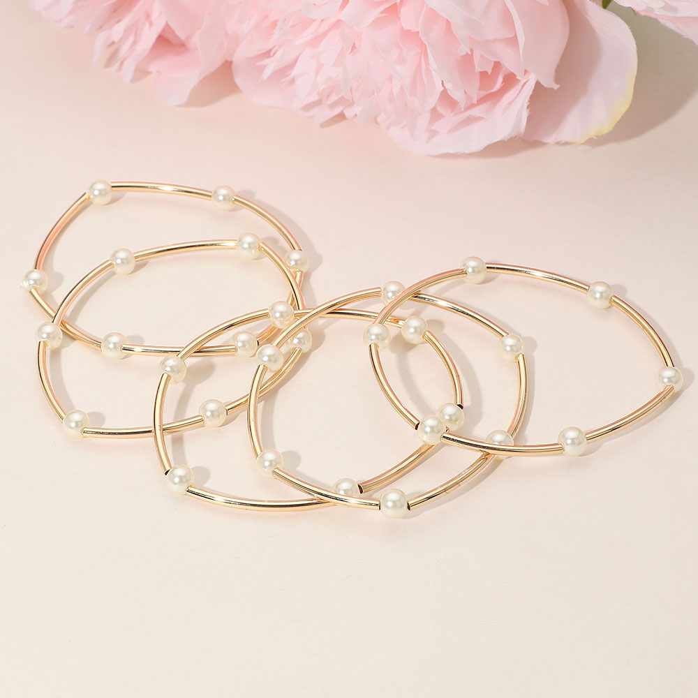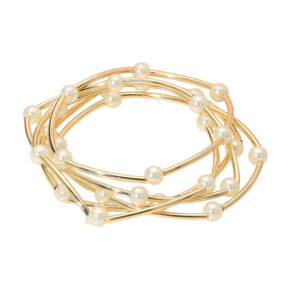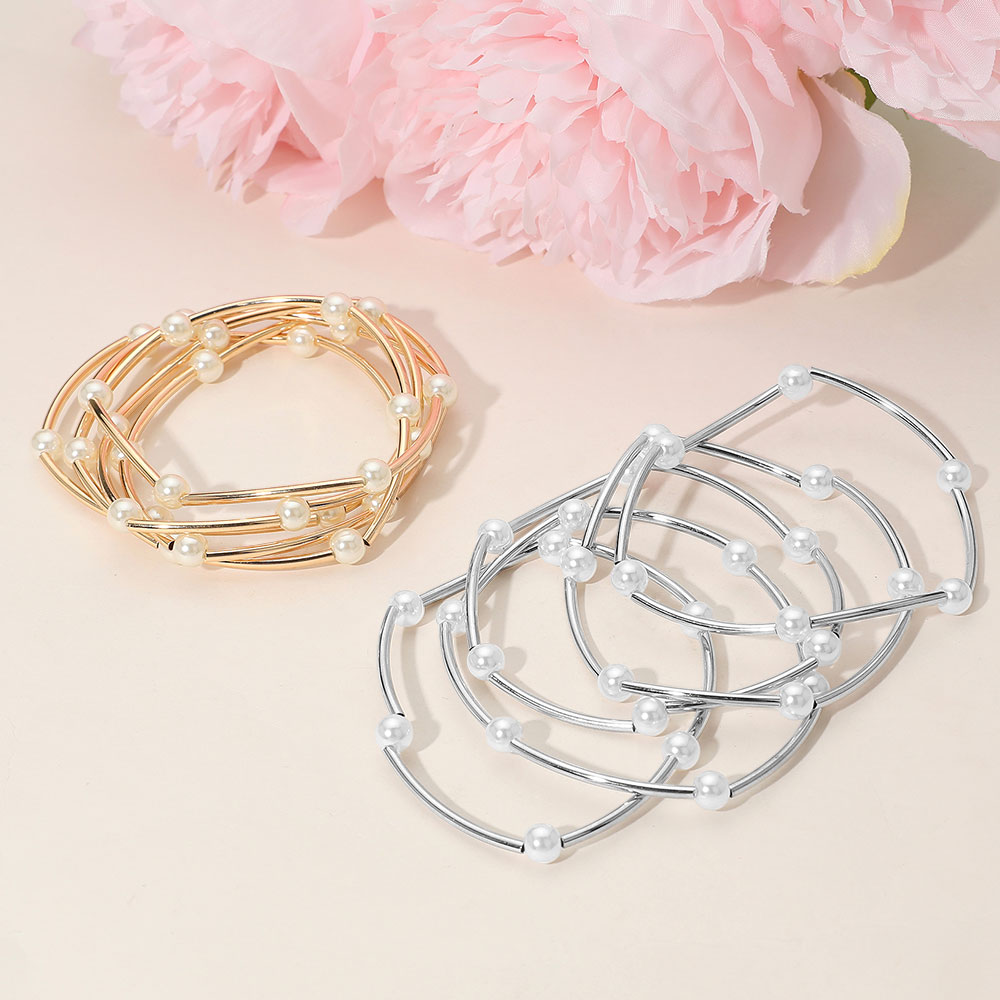 Details • Size : 1.25" H • Stretchable • This graceful bangle bracelet set features slender bands adorned with lustrous beaded accents for a refined, feminine look. Its layered, airy design makes it a perfect choice for adding a delicate yet eye-catching touch to both casual and formal outfits. • Lead and Nickel Compliant