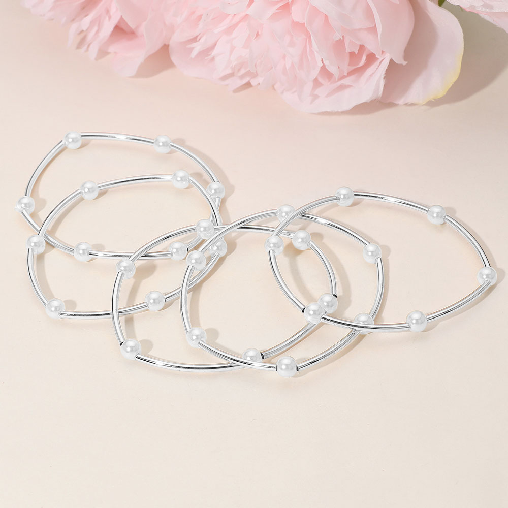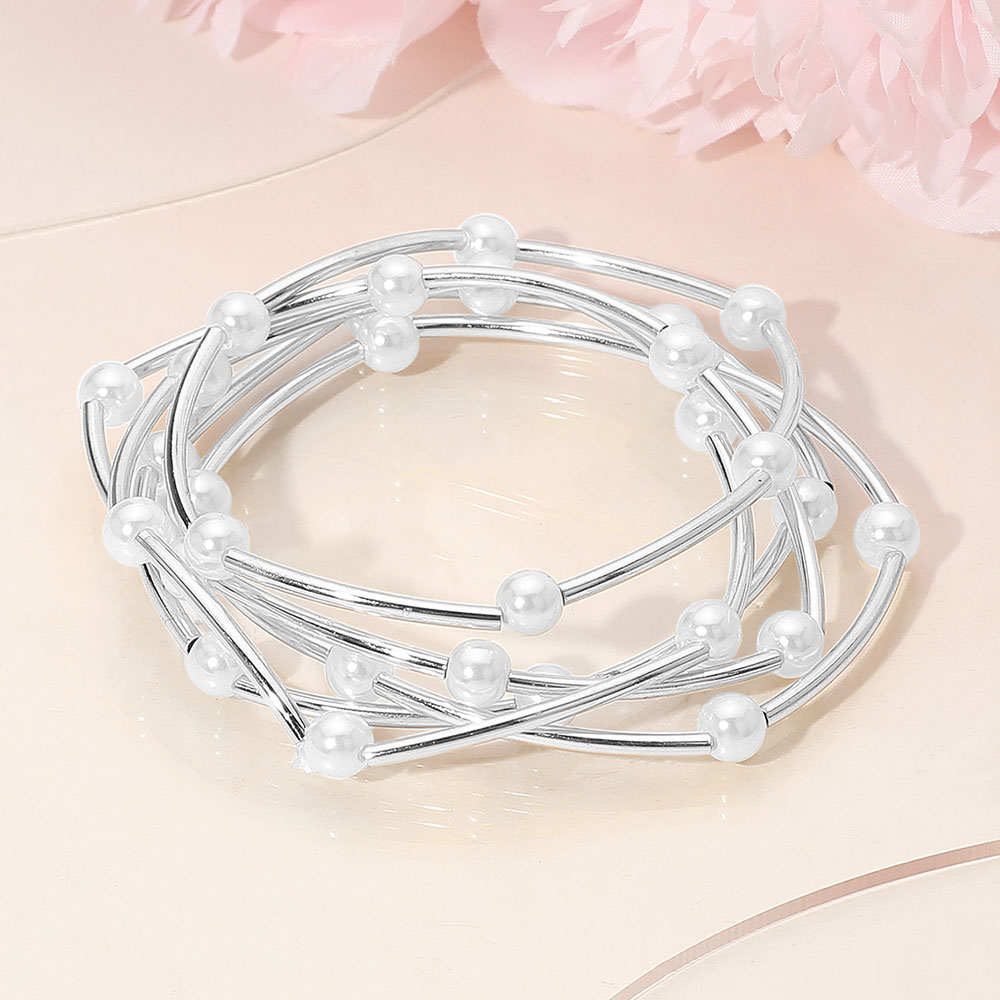Details • Size : 1.25" H • Stretchable • This graceful bangle bracelet set features slender bands adorned with lustrous beaded accents for a refined, feminine look. Its layered, airy design makes it a perfect choice for adding a delicate yet eye-catching touch to both casual and formal outfits. • Lead and Nickel Compliant