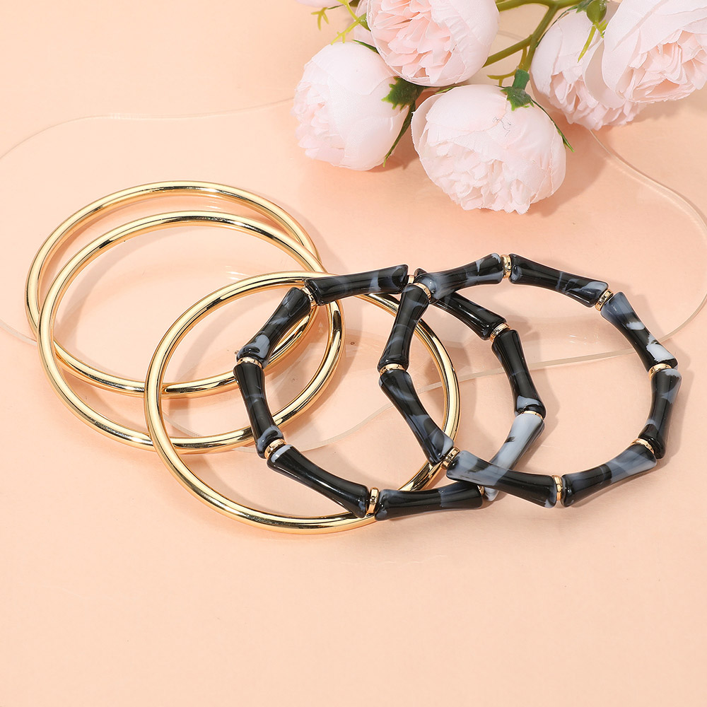 5PCS - Resin Bamboo Beaded Stretch Glossy Metal Bangle Stackable Multi Layered Bracelets