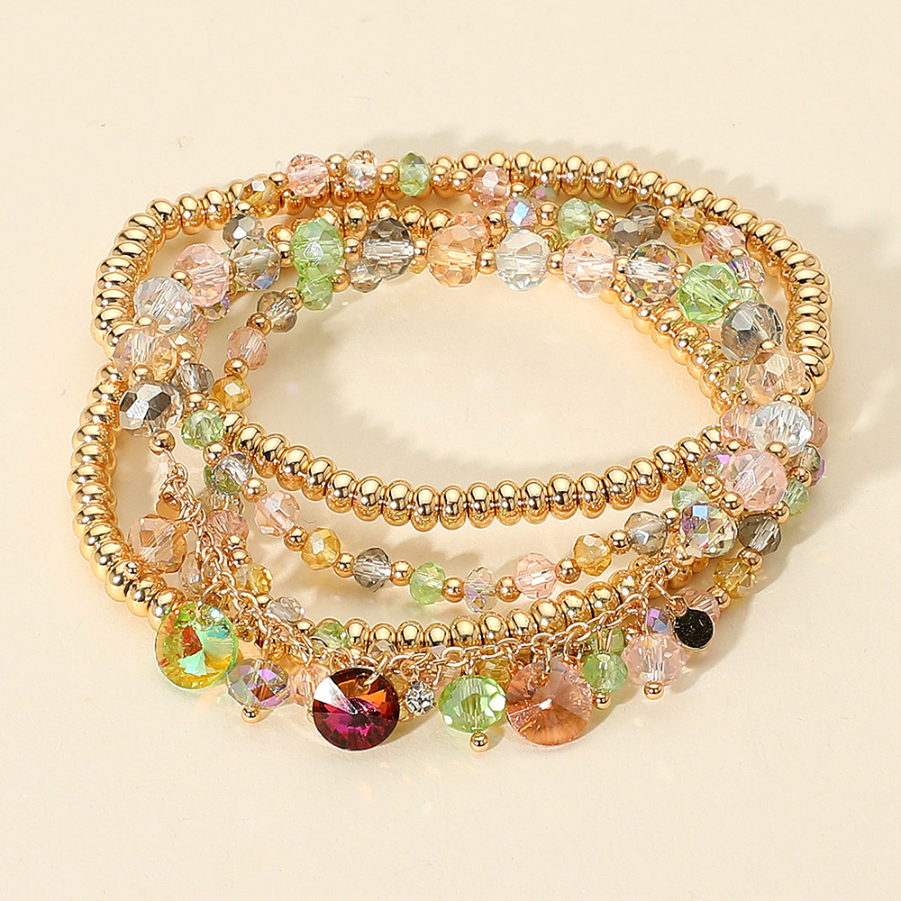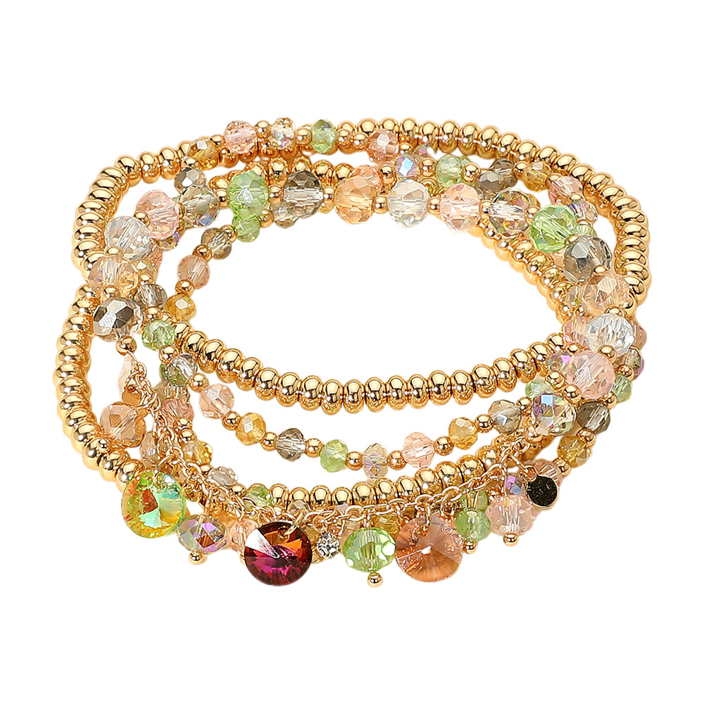 5PCS - Round Stone Charm Station Faceted Beaded Stretch Multi Layered Bracelets