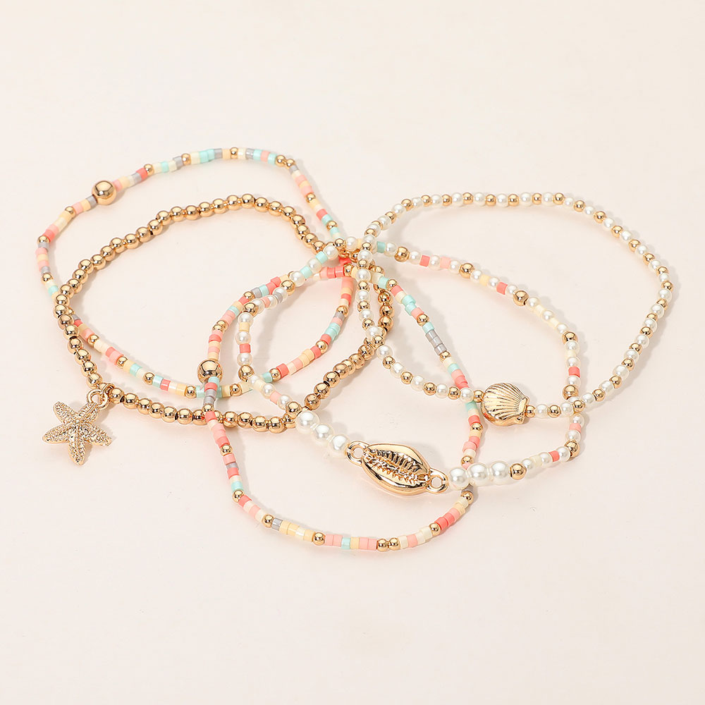5PCS - Starfish Seashell Charm Pearl Seed Beaded Stretch Multi Layered Bracelets