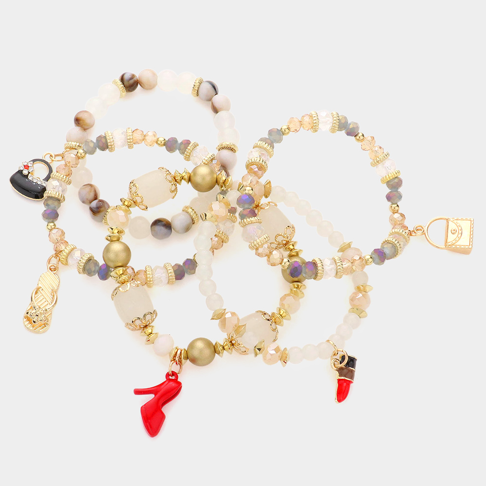 5PCS - Tote Bag Flip Flop Stiletto Heel Lipstick Charm Multi Beaded Stretch Bracelets