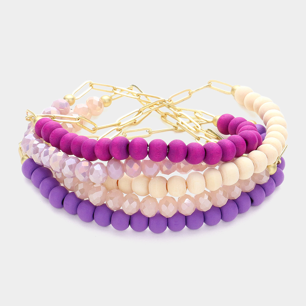 5PCS - Wood Faceted Beaded Paperclip Chain Stretch Multi Layered Bracelet