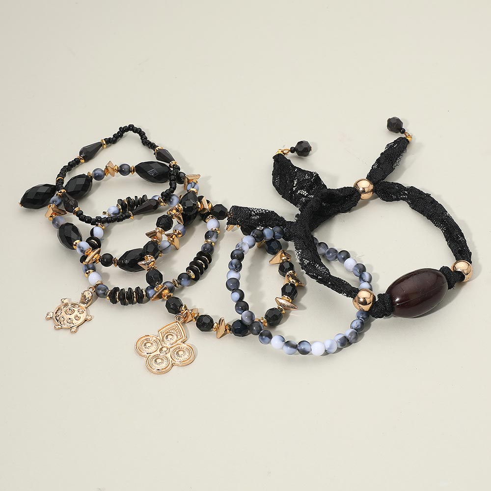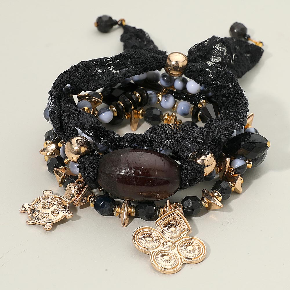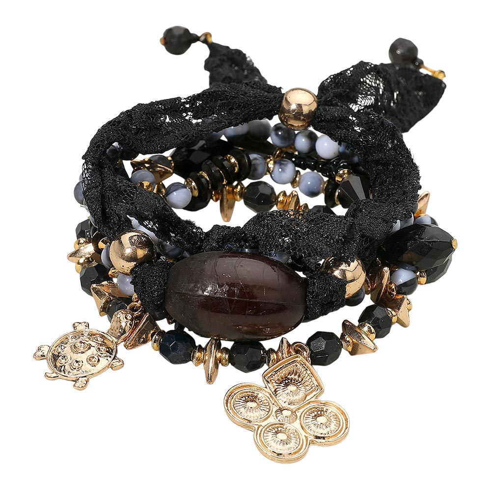 Details • Size 1 : 1.25" H / Stretchable • Size 2 : 0.75" H / Adjustable • Elevate your layered bracelet look with this boho stackable bracelet set featuring mixed beads, fabric detailing, and charm accents for effortless style. Designed for easy everyday wear, the set includes multiple slip-on and adjustable pieces you can stack together or style separately. A perfect statement for vacations, festivals, and casual outfits. • Lead and Nickel Compliant • Made In India