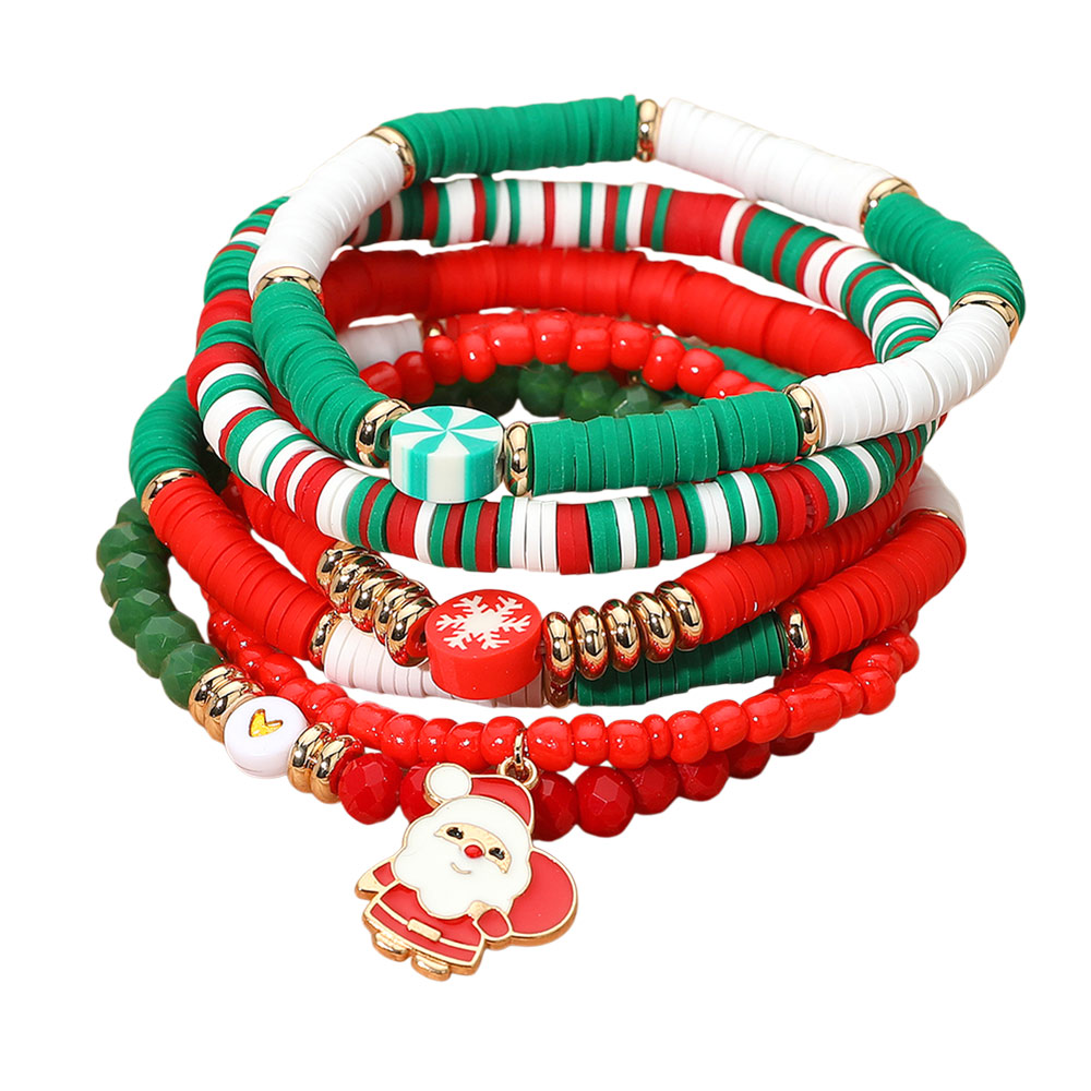 Details • Size : 1.75" H • Charm Size : 0.7" X 0.8" • Stretchable • Celebrate the season with this Christmas stackable bracelet set featuring festive beads, holiday accents, and a Santa charm. A playful and cheerful accessory, perfect for parties, gifting, or adding a touch of holiday spirit to any look.