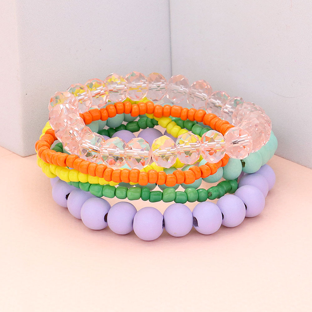• Complete your look with this multi-strand beaded bracelet set, featuring smooth round beads, faceted crystal accents, and delicate seed bead strands. Perfect for layering, this stretch design offers versatile style that transitions effortlessly from casual wear to elegant outfits with modern charm.