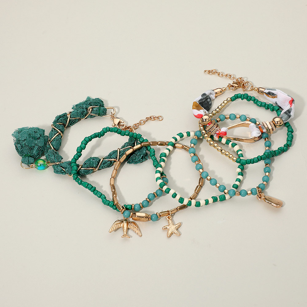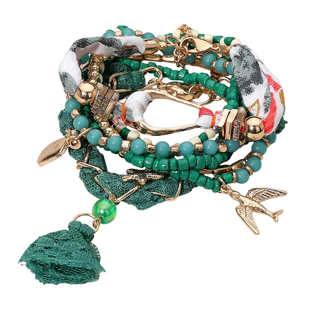 Details • Size 1 : 1" H / Stretchable • Size 2 : 1" H, 7" + 2" L / Lobster Clasp Closure • Boho bird fabric tassel starfish charm bracelet set featuring layered beaded strands, fabric-wrapped details, tassel styling, and mixed symbolic charms like a bird and starfish for a playful nature-inspired accessory look. Designed for stacking and everyday wear, adding unique artisan flair to casual outfits and gifting occasions. • Lead and Nickel Compliant • Made In India