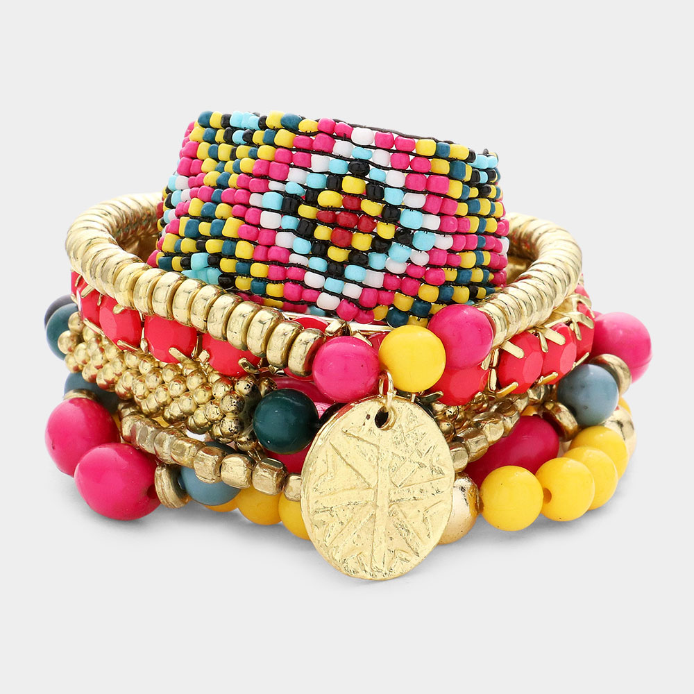 7PCS - Boho Multi Beaded Disc Charm Stretch Bracelets