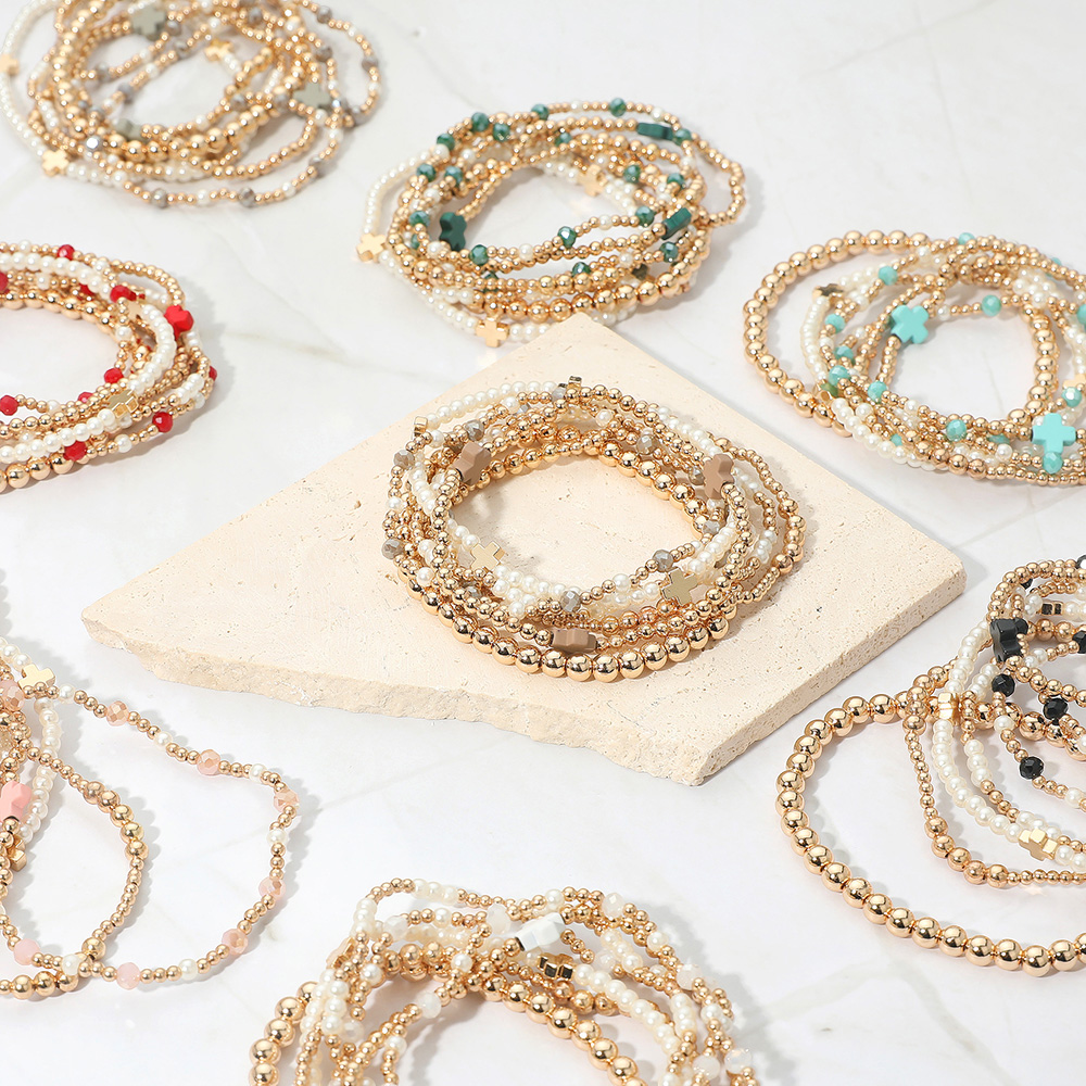 Details • Size : 1.3" H • Stretchable • Elegant multi-strand beaded bracelet set featuring smooth and faceted beads with cross accents. Designed with stretch for a comfortable fit, this layered bracelet set adds a touch of style and meaning, perfect for casual wear, special events, or stacking with other jewelry pieces. • Lead and Nickel Compliant