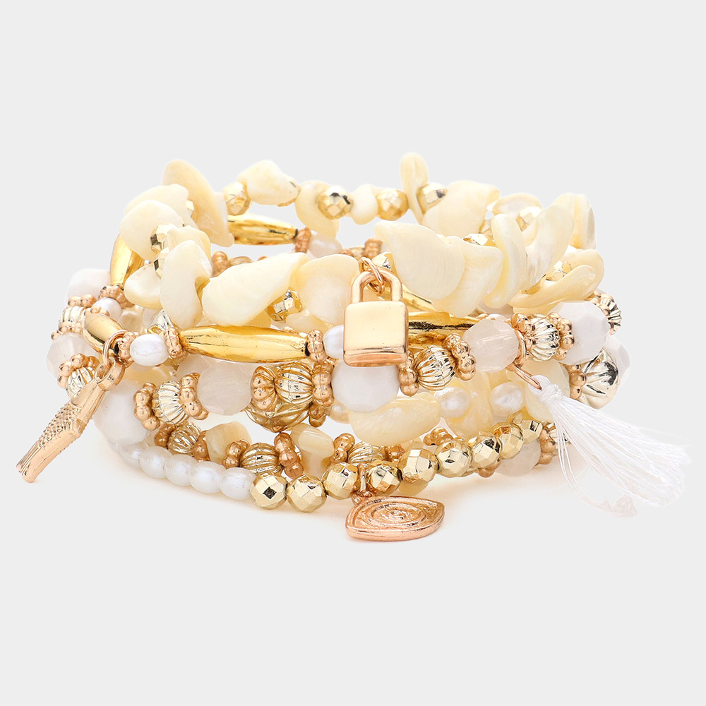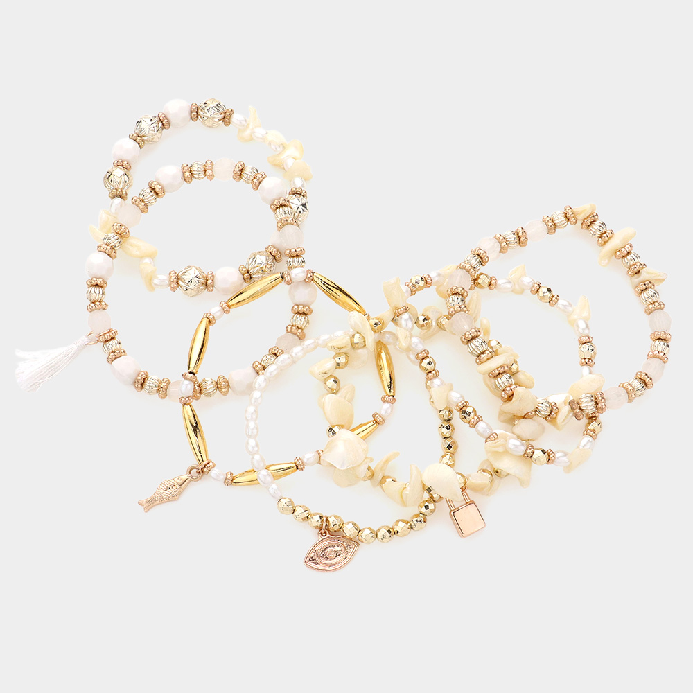 7PCS - Faceted Beads Pearl Mother Of Pearl Beaded Metal Evil Eye Fish Tassel Charm Stretch Multi Layered Bracelets