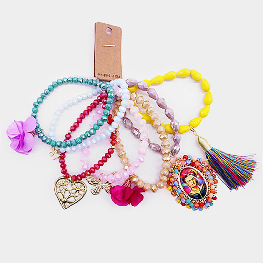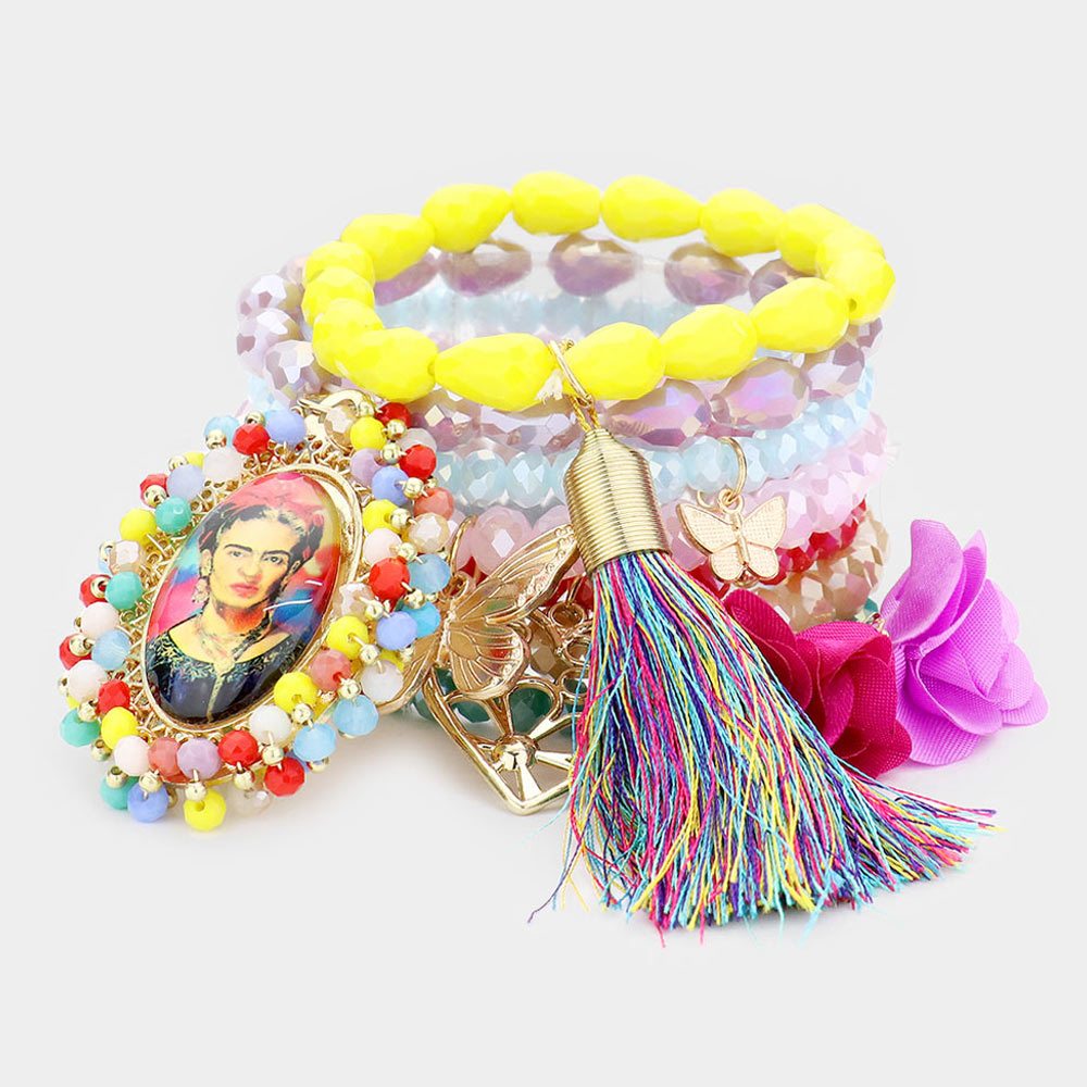7PCS - Frida Kahlo Heart Butterfly Tassel Charm Faceted Beaded Stretch Bracelets