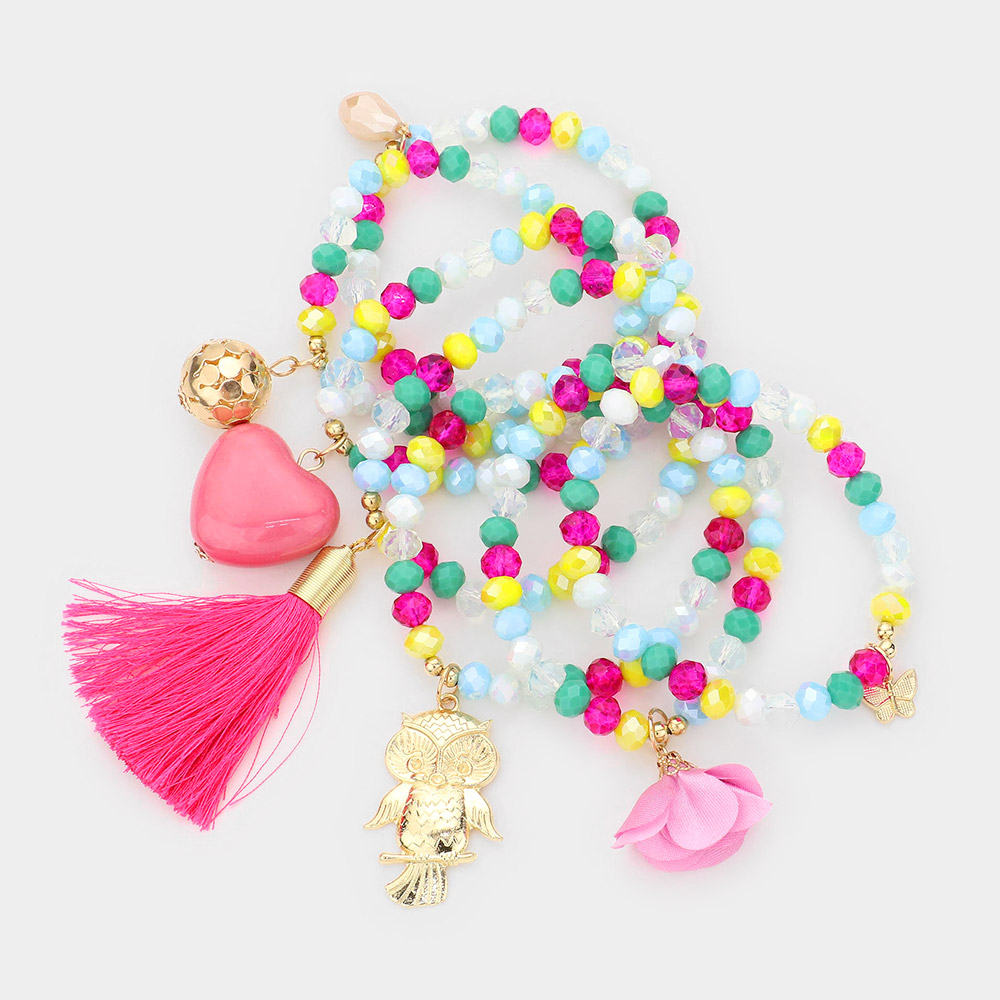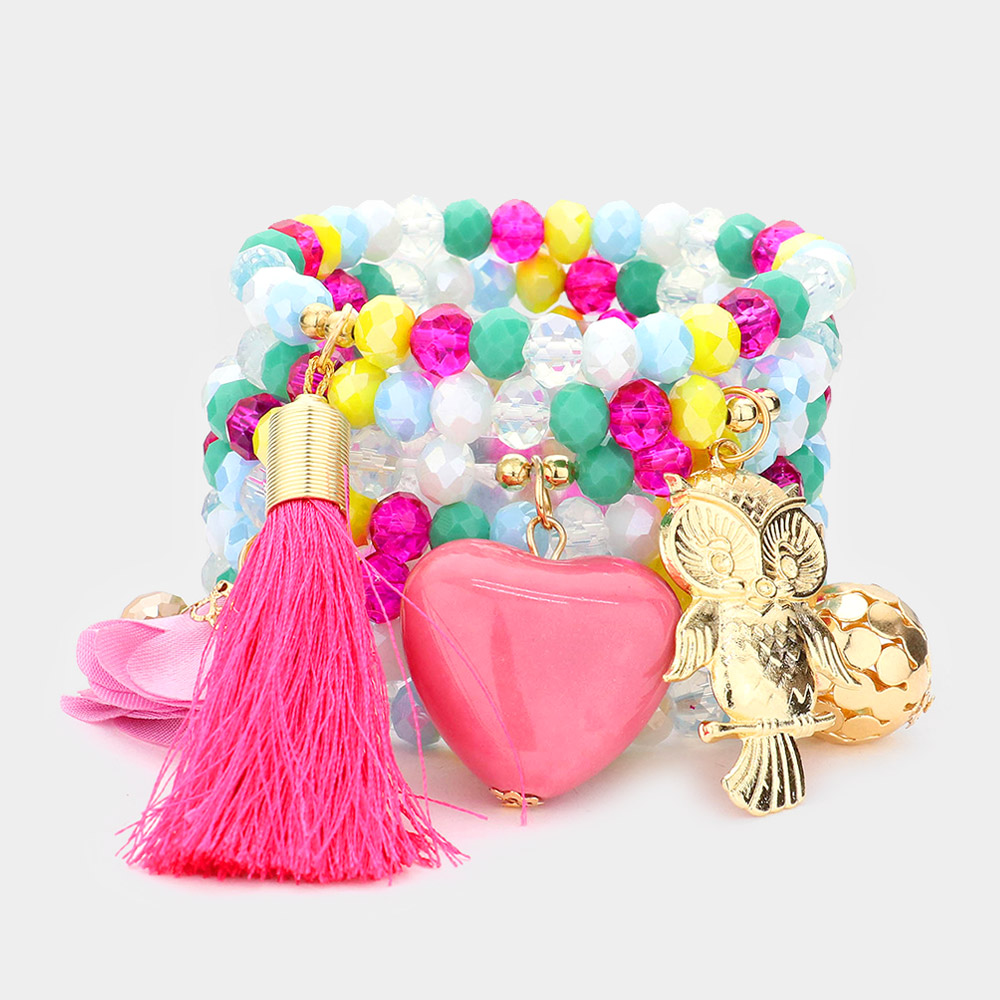 7pcs - Heart Owl Fabric Flower Butterfly Tassel Charm Faceted Beaded Bracelets